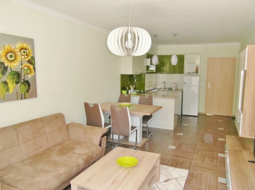 Имотът е обзаведен, с площ 60 кв.м, на 4-ти от 7 етажа в сграда с асансьор. Разпределението включва входно антре, дневна с кухня и трапезария, спалня, баня с тоалетна и тераса.