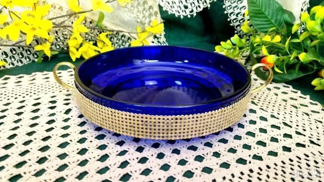 Стъклена купа, "кобалтово стъкло" поради синия цвят, който се постига чрез добавяне на кобалтов оксид към стъклената смес и златен метален обков.