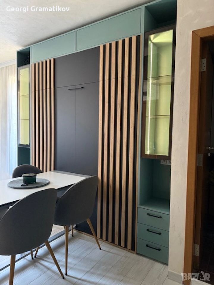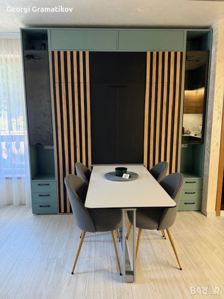 Автоматично падащо легло/160х200/, което сгъва трапезната маса, ТВ с въртяща се стойка на 360 градуса/с цифрова телевизия и интернет/.