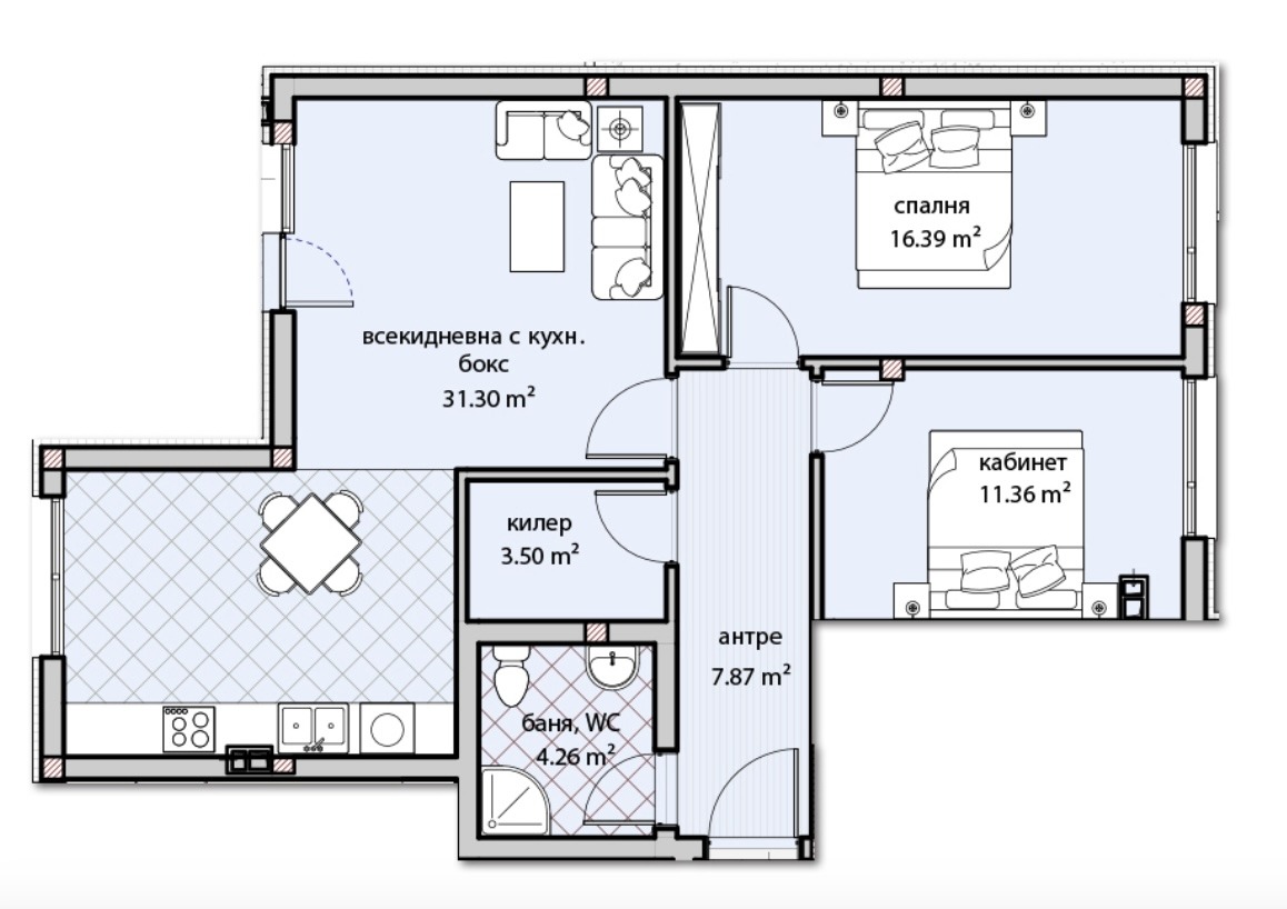 Имотът Представлява : Входно антре, всекидневна с обособена кухненска част около 32 кв.м, 2 спални около 16кв.м и 12кв.м и баня с тоалет в едно и 2 тераси и килер 3.5кв.м. Имотът е разположен на 7 жилищен етаж от общо 7
