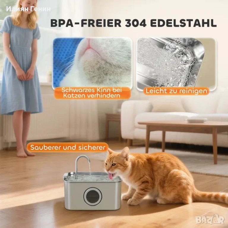 Здрава неръждаема стомана: Изработена от висококачествена неръждаема стомана 304, тази фонтанка за пиене гарантира издръжливост и поддържа здравето на вашия домашен любимец, като предотвратява растежа на бактерии, особено при котки с акне по брадичката или чувствителна кожа.