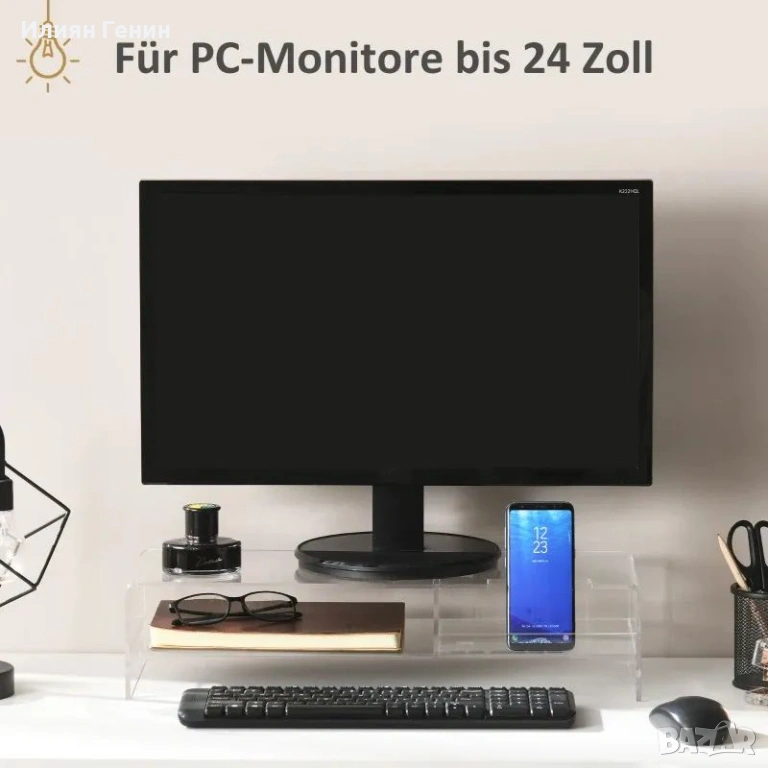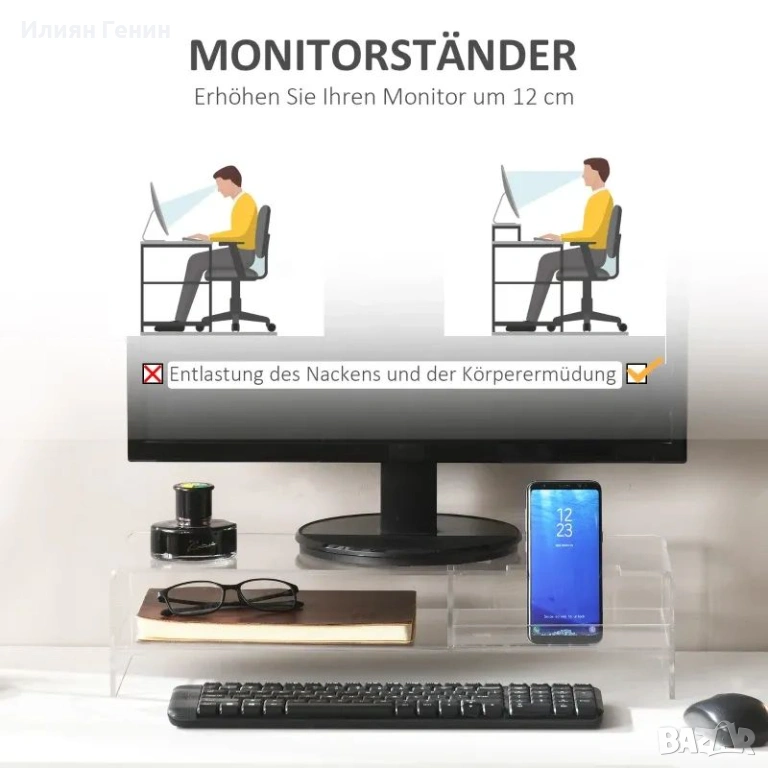 Подобрете стойката и комфорта си: Повдигнете екрана си с 12 см с нашата акрилна стойка за компютърен монитор. Намалете напрежението в очите, защитете шийните прешлени и създайте оптимални условия за работа. Кажете сбогом на постоянното навеждане и се насладете на здравословна седнала стойка.