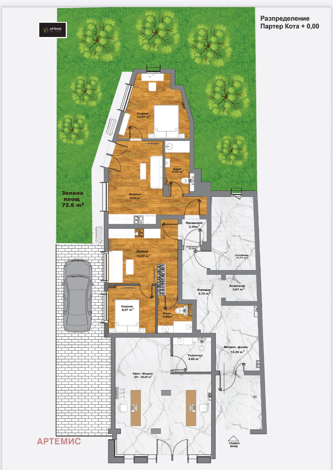 Апартамента е ситуиран на партерен етаж със застроена площ 82,32кв.м. и собствен двор от 73кв.м.