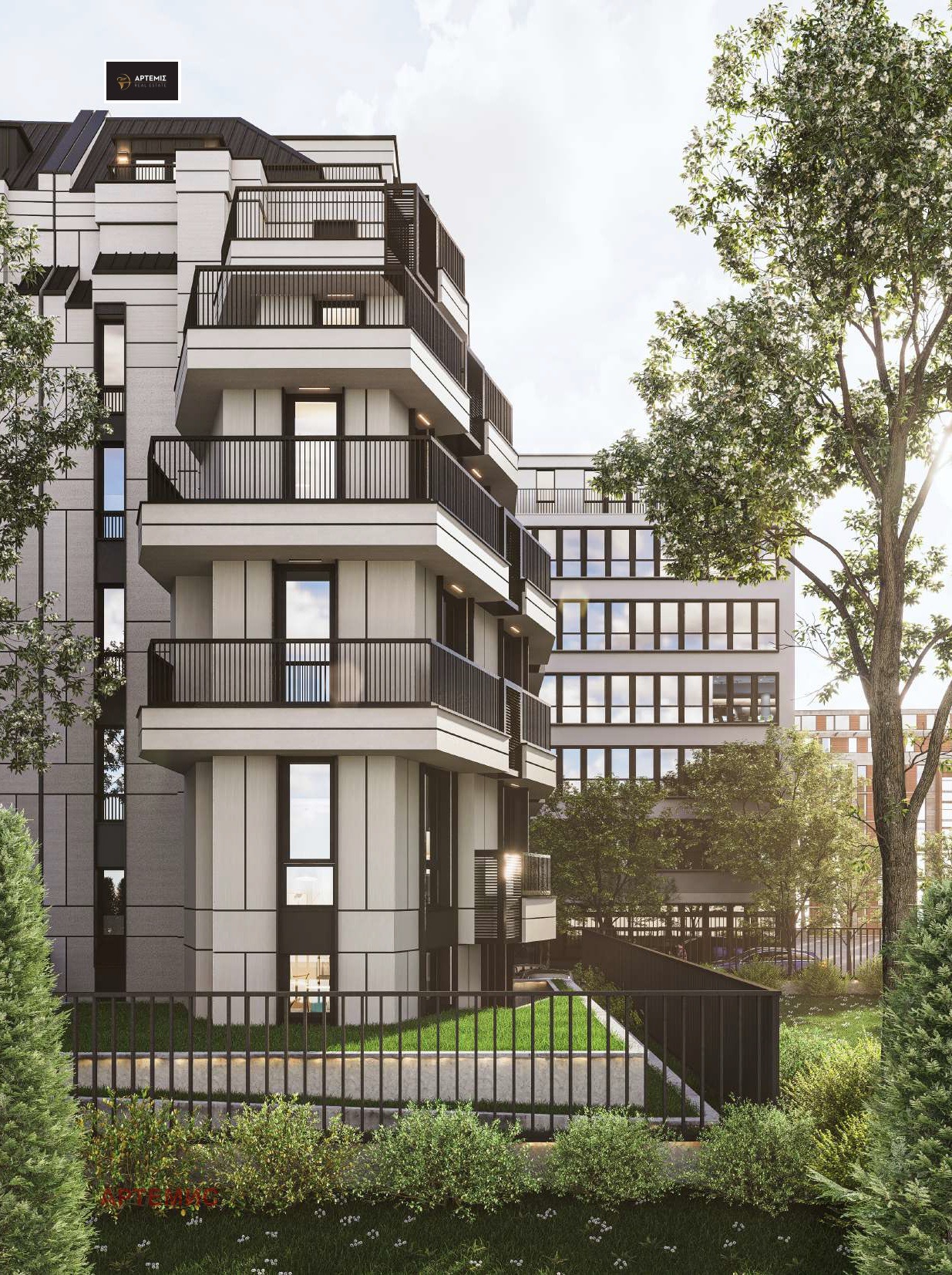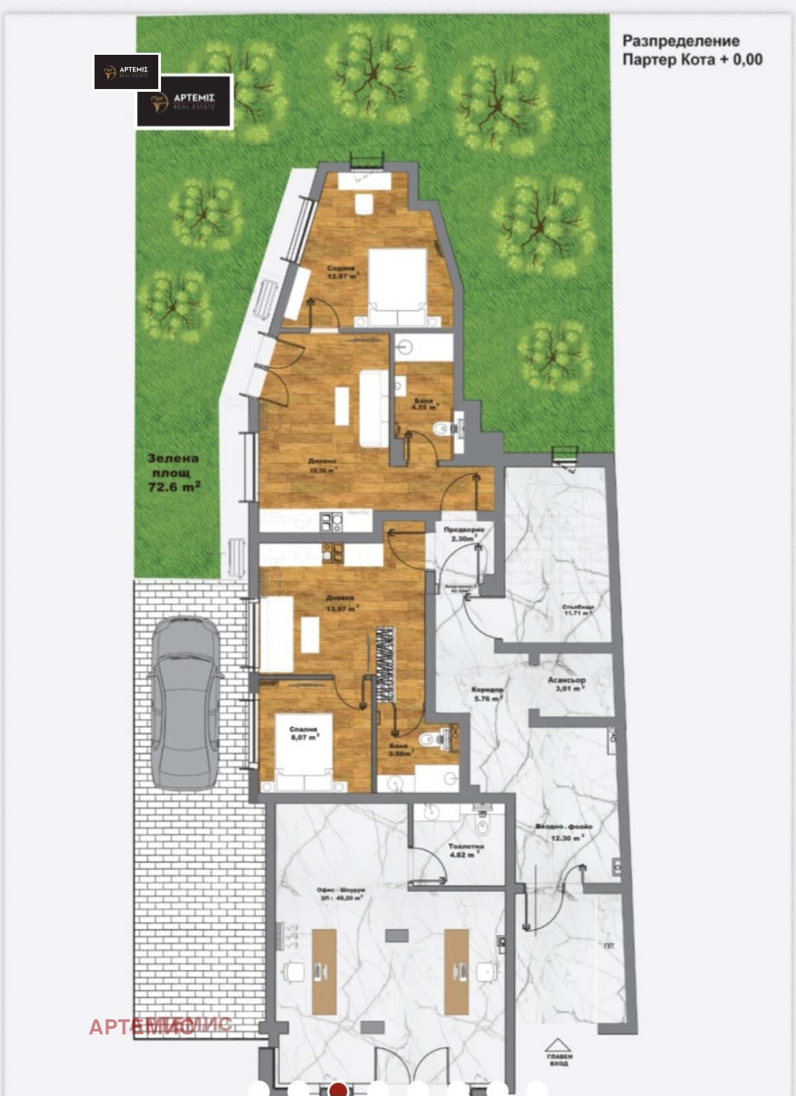 Апартамента е ситуиран на партерен етаж със застроена площ 82,32кв.м. и собствен двор от 73кв.м.