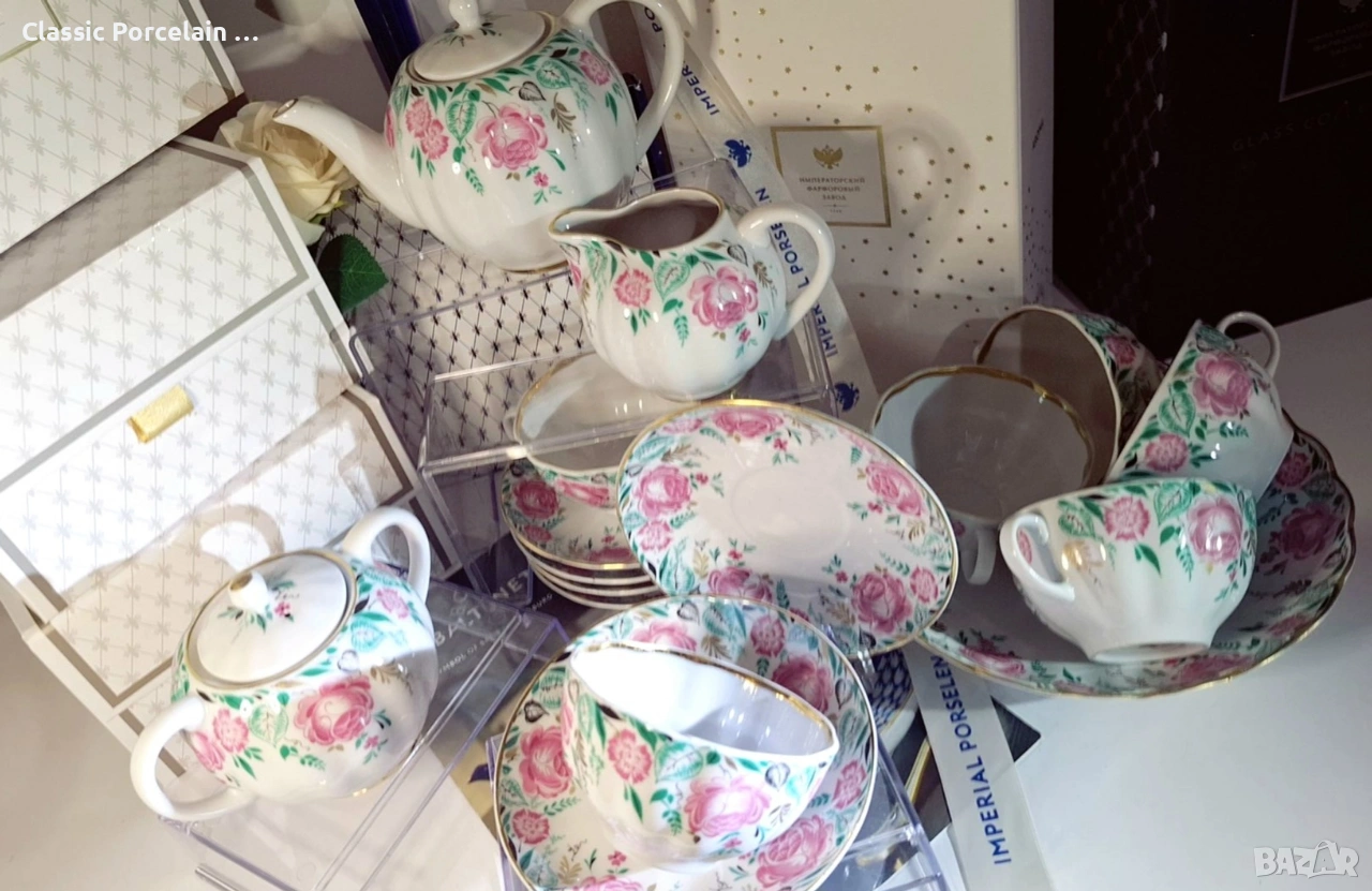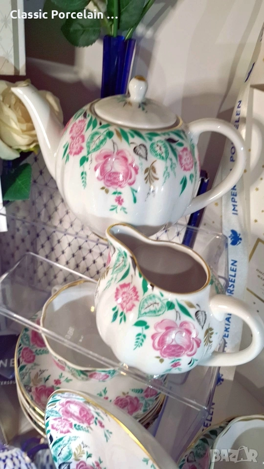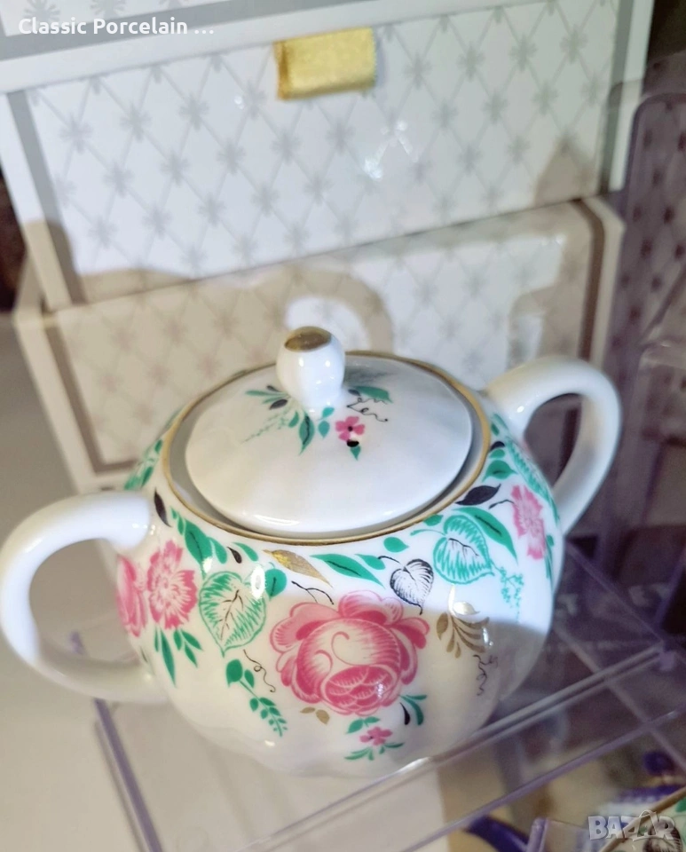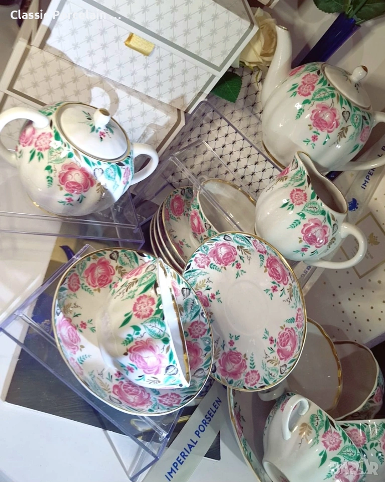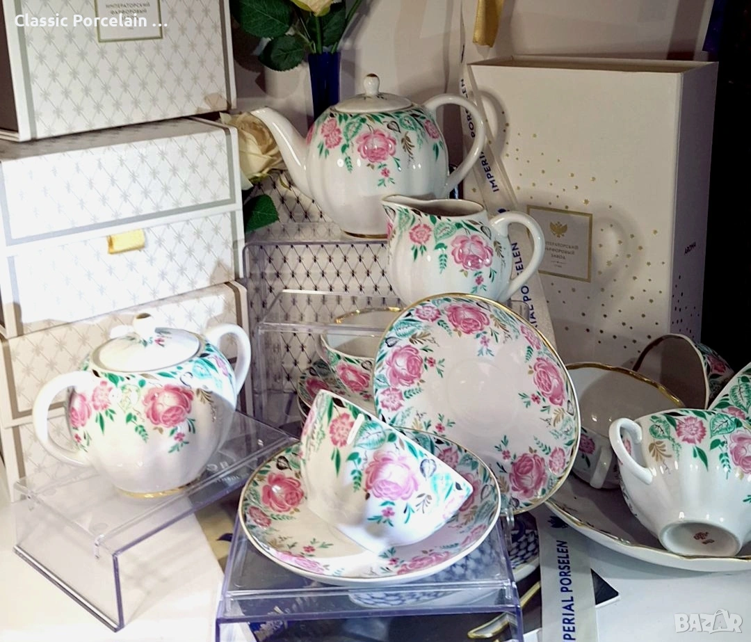 ЛФЗ „Розов божур“ Чайник, захарница, каничка, чиния за сладки 21 см, 6 чашки (250 мл), 6 подложни чинийки Цена: 450 евро