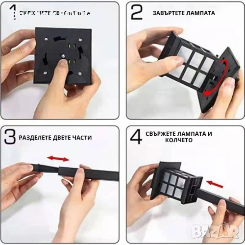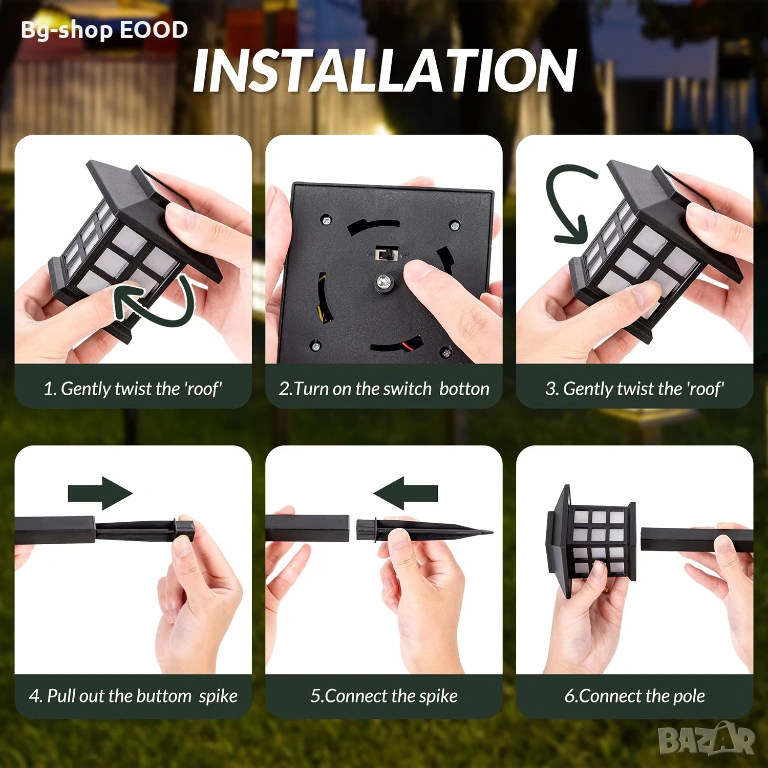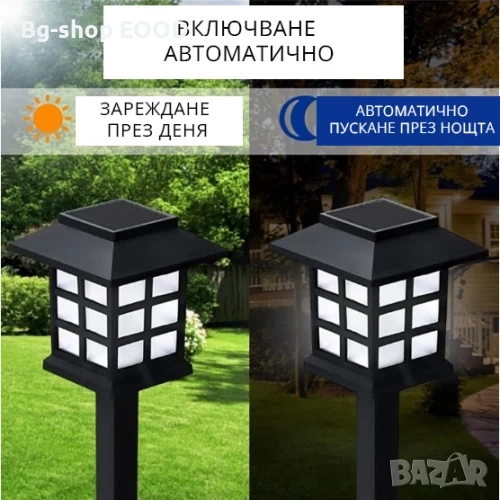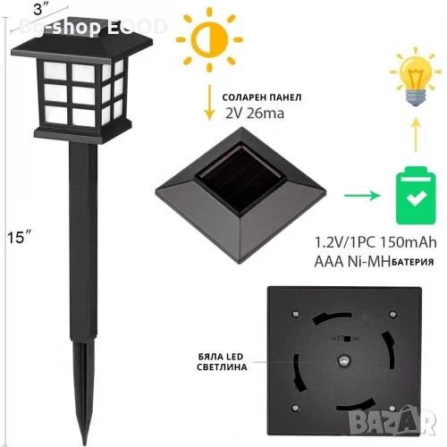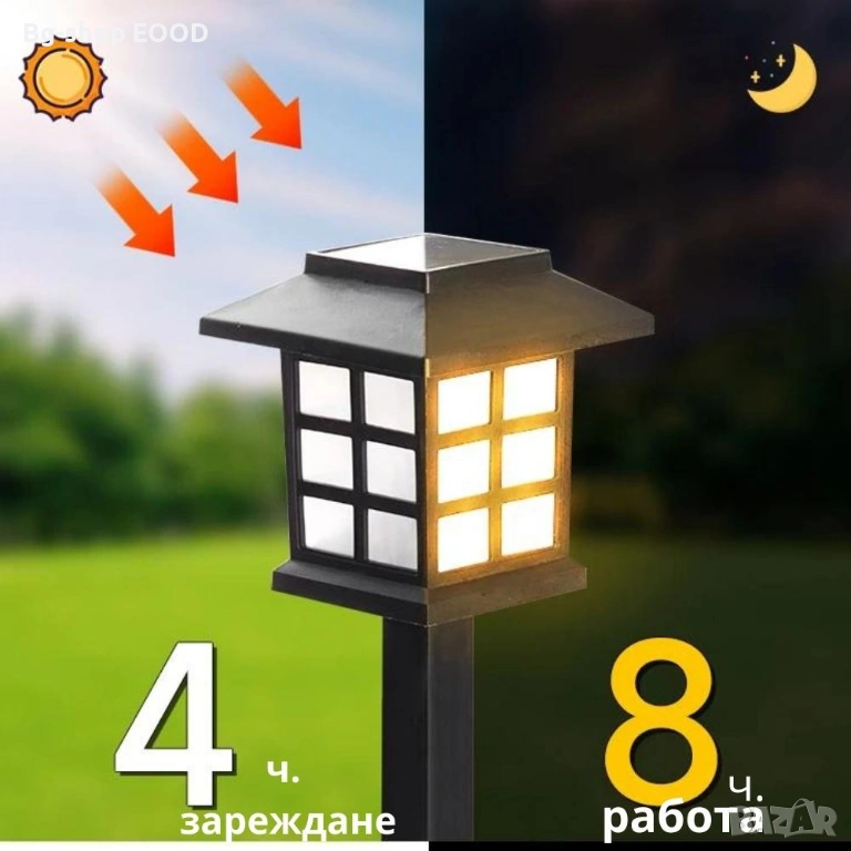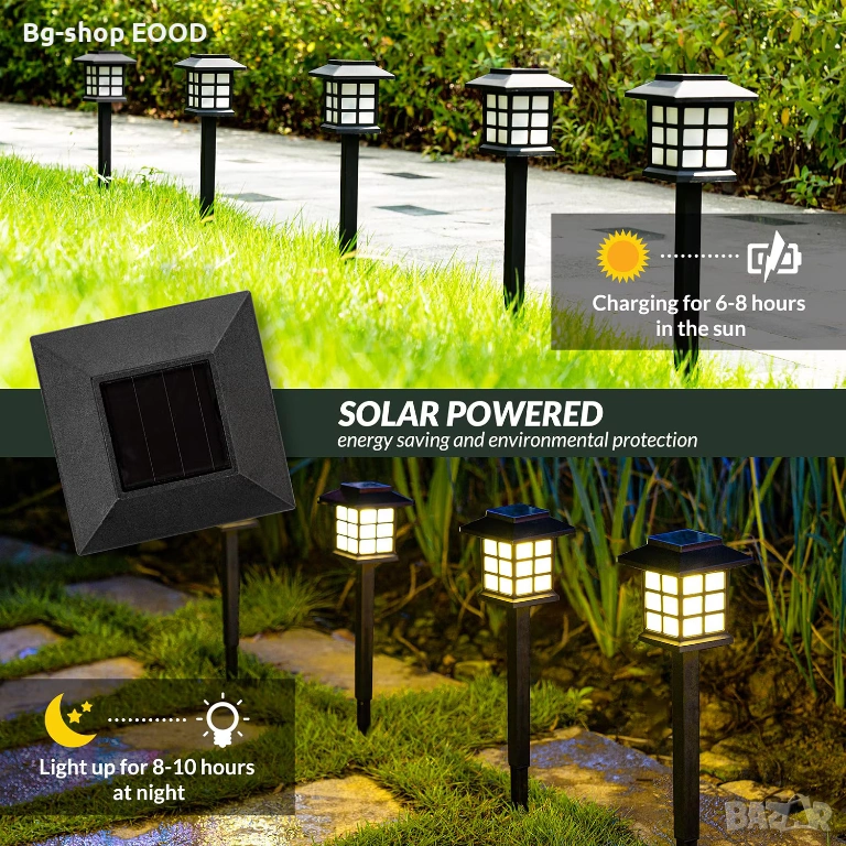 Лампите се зареждат през деня от слънчева светлина чрез вграден соларен панел. При стъмване се включват автоматично и светят до 8 часа при пълно зареждане.