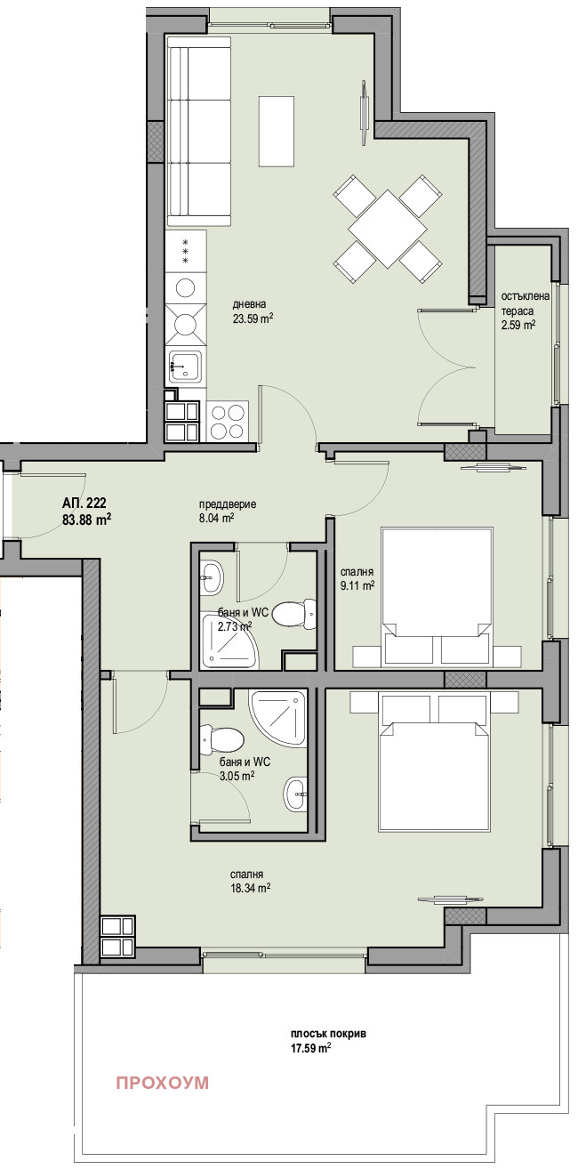 Функционални разпределения на двустайни, тристайни апартаменти.