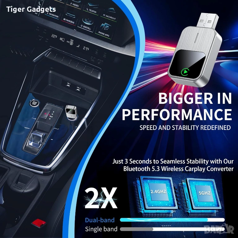 Работи с Bluetooth и 5GHz WiFi, което осигурява стабилна връзка и ниска латентност при използване на навигация, музика и разговори. Разполага с бутон за reset, който позволява лесна смяна между различни устройства.