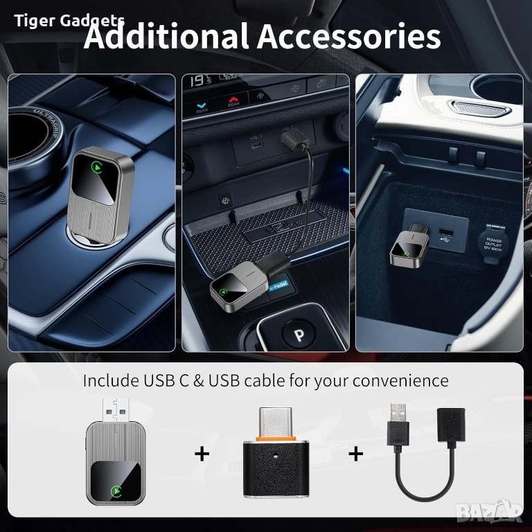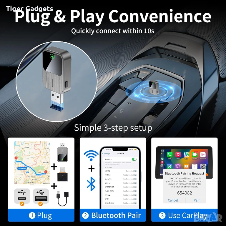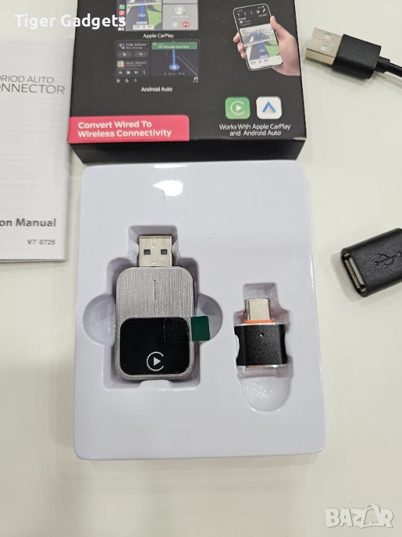 Свързването е бързо и лесно – включвате устройството в USB порта, активирате Bluetooth и WiFi и системата се настройва автоматично. След първоначалната връзка, адаптерът се свързва автоматично при всяко стартиране на автомобила.