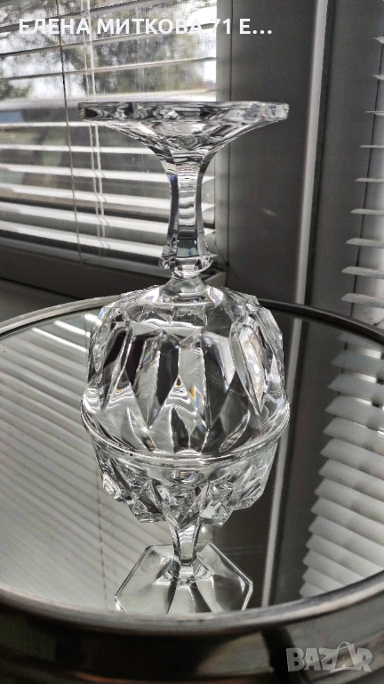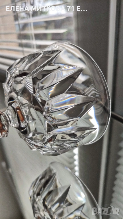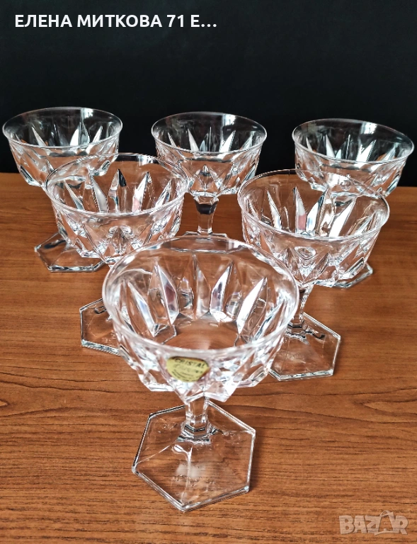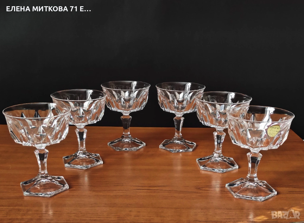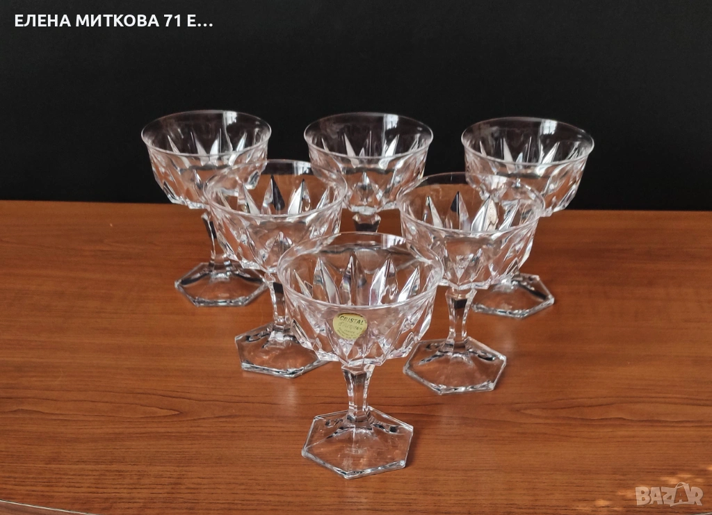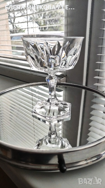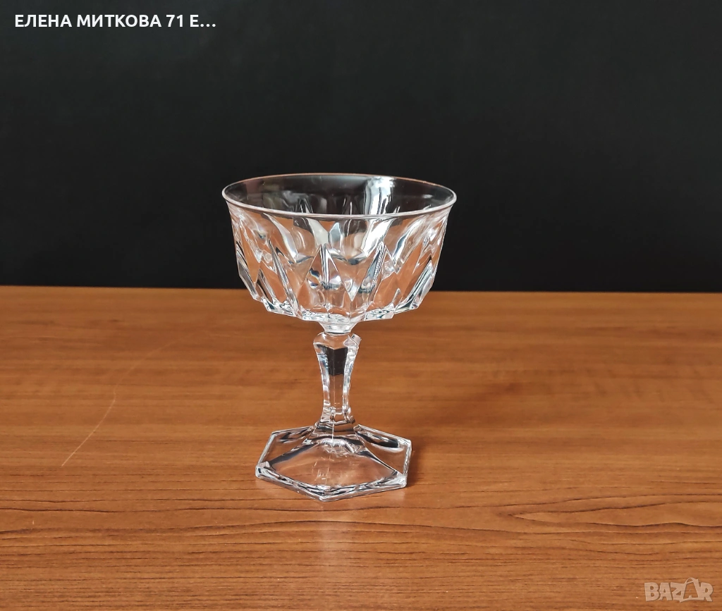 Сервиз от 6 бр. тежки кристални чаши със шестоъгълна основа и геометрични фасети наподобяващи диамант Самото столче също е шестоъгълно