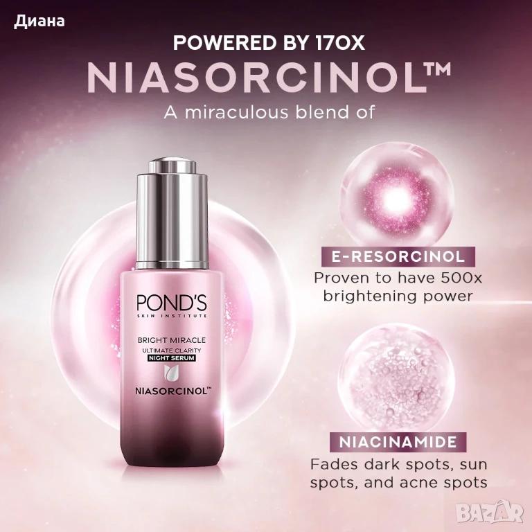 Кожата се възстановява 2 пъти по-бързо през нощта, отколкото през деня. Нощният серум Ultimate Clarity подсилва това естествено възстановяване с най-високата концентрация на ниасорцинол™️.Niasorcinol™️ е най-добрата и най-нова технология за изсветляване от POND'S. Това е мощна смес от ниацинамид, която избледнява слънчеви петна, следи от акне и E-резорцинол, който усилва ниацинамида за 100% повече изсветляваща сила. Разполага с технология за микро-възстановяване, която прониква в дълбочина до 10 слоя, за да поправи микро-уврежданията в кожата, причиняващи упорити тъмни петна, следи от акне и матов тен.