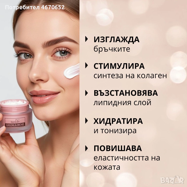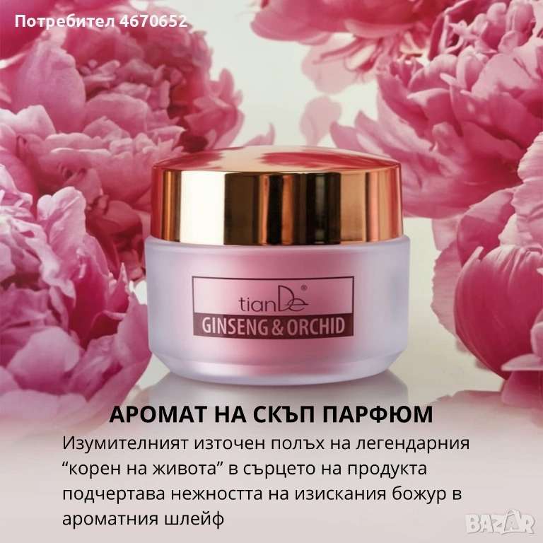 Кремът за лице „Женшен и орхидея“ е разработен за преобразяване на кожата на клетъчно ниво. Козметиката за грижа от ТианДе стимулира синтеза на колаген, хидратира, възстановява липидния слой, изглажда бръчките, тонизира и повишава еластичността.