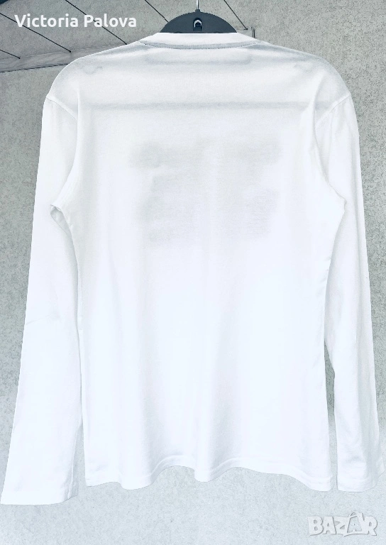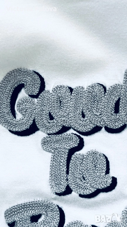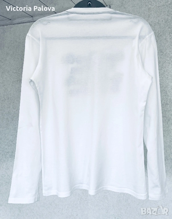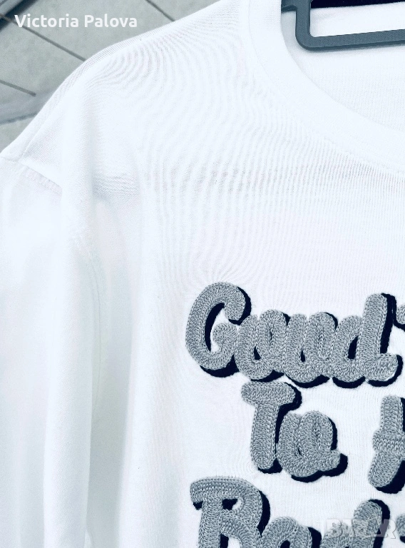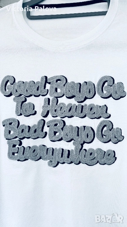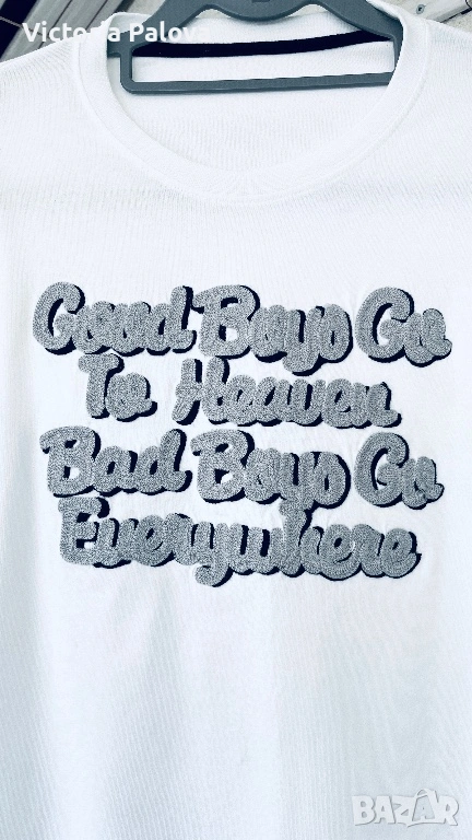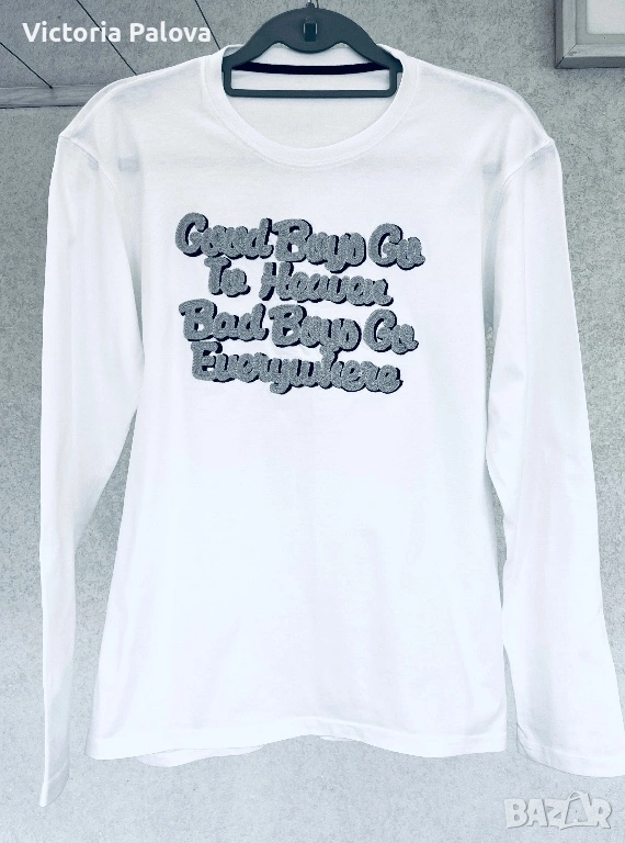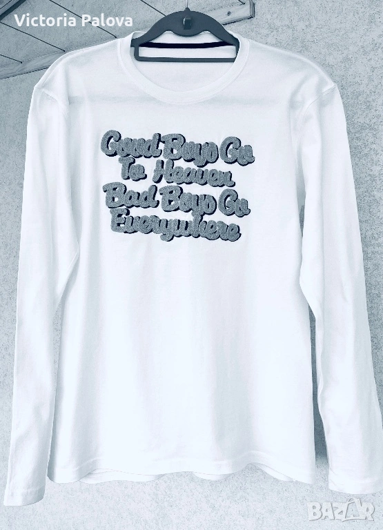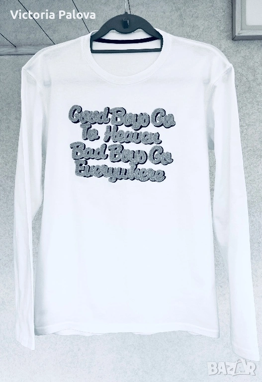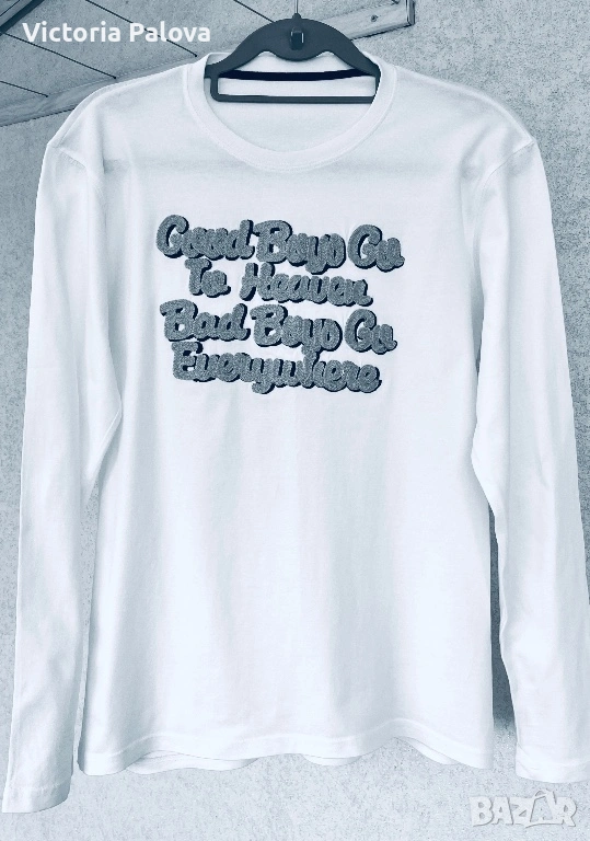 Ефектна бяла блуза с дълъг ръкав ( Италия) е идеалният избор за всеки ( унисекс), който търси комбинация от дързък стил и високо качество. Основният акцент е масивната 3D бродерия с популярната фраза „Good Boys Go To Heaven, Bad Boys Go Everywhere“ (Добрите момчета отиват в Рая, а лошите – навсякъде), която веднага привлича погледа със своя релеф и текстура. За разлика от стандартните щампи, тук надписът е изпълнен чрез професионална обемна бродерия тип „синел“, гарантираща дълготрайност и премиум визия. Цветовото съчетание от светлосиви букви с плътен черен контур придава на дизайна допълнителна дълбочина и стил върху чистия бял фон. Материята е плътен и мек памук, който осигурява комфорт през целия ден, а нивото на детайлност на изработката е изключително високо. Блузата е в отлично състояние и следва точните размери от 46 см от рамо до рамо, 52 см ширина под мишниците, 66 см обща дължина и 61 см дължина на ръкава.
