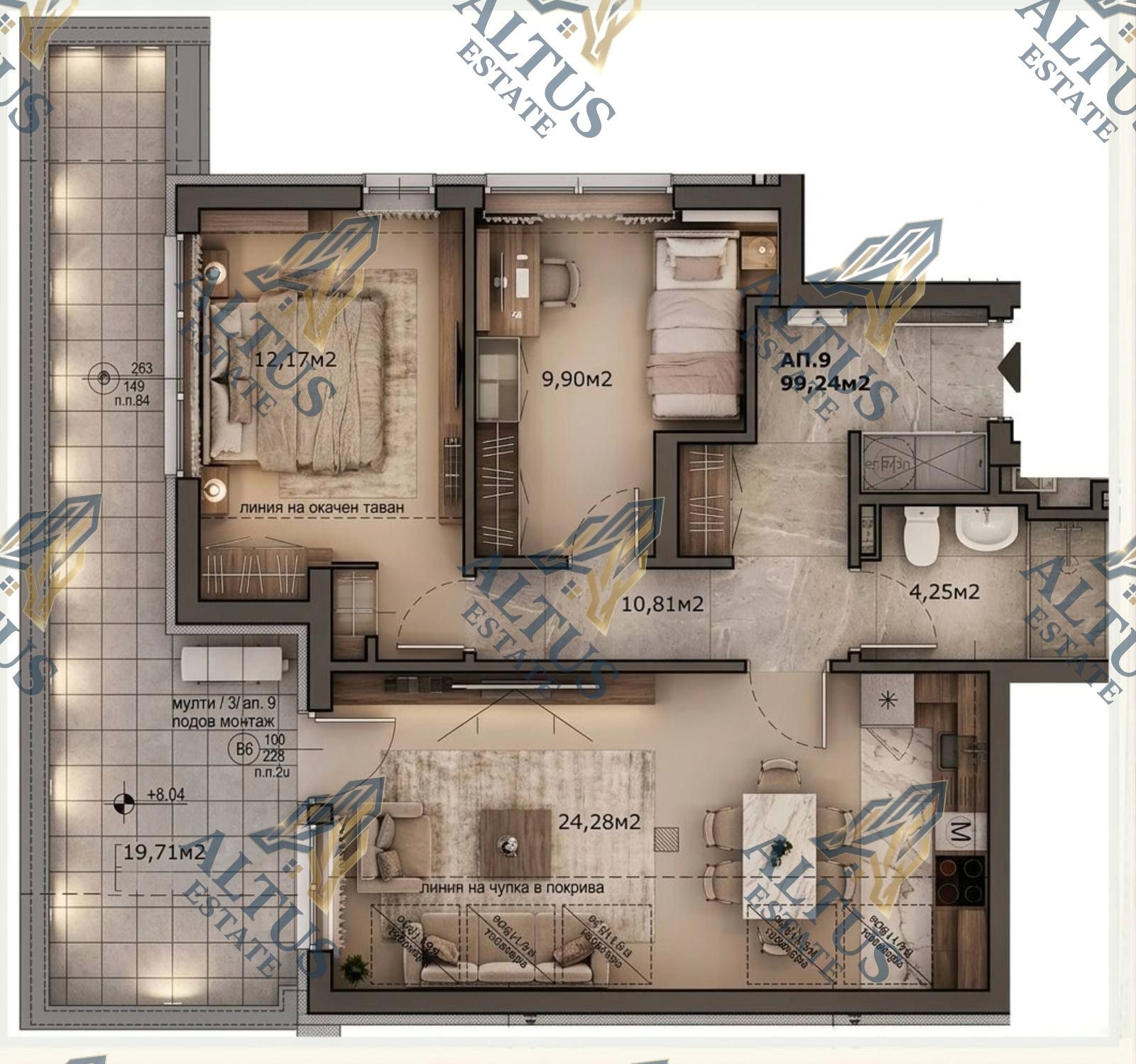 💎 Акцентът на имота: Впечатляваща голяма тераса, която се превръща в естествено продължение на дневната. Идеална за оформяне на лятна градина, зона за барбекю или външен кът за почивка с панорамна гледка.