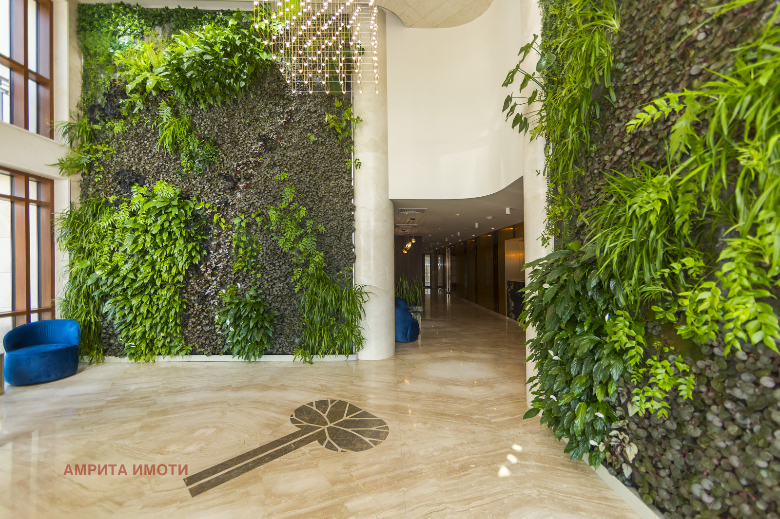 Прекрасно озеленен вътрешен двор с алеи за разходка, релакс зони и модерна детска площадка.