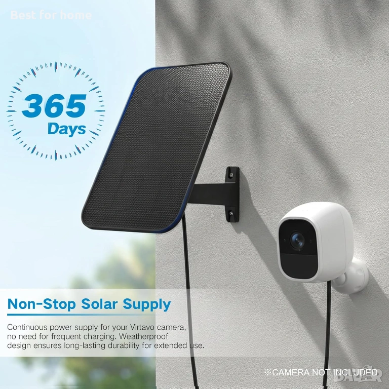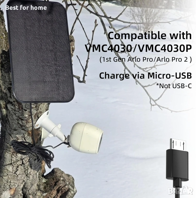 【Перфектен за камери VIRTAVO и Arlo Pro/Pro 2】 Създаден специално за охранителни камери VIRTAVO, захранвани с батерии, с безпроблемна съвместимост с директно включване през Micro USB. Работи перфектно и с Arlo Pro (VMC4030), Arlo Pro 2 (VMC4030P), Arlo Essential (VMC2030) и повечето камери с акумулаторни батерии 5V с Micro USB вход. Не е необходим официален соларен панел Arlo — този 3.2W панел осигурява 68% повече мощност от стандартните опции за зареждане на Arlo. Забележка: Соларният панел няма вградена батерия. Вашето устройство трябва да съдържа акумулаторна батерия.
