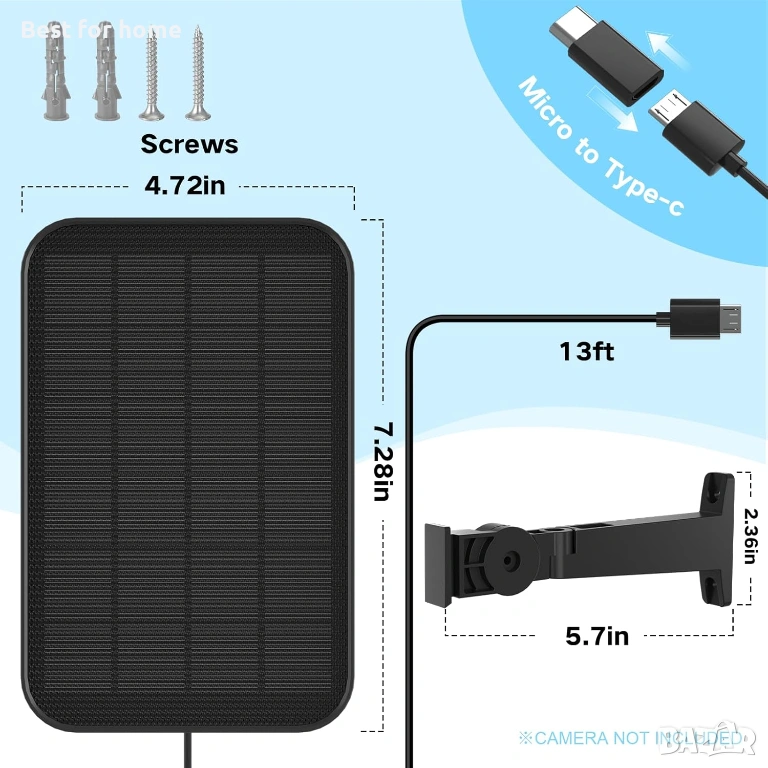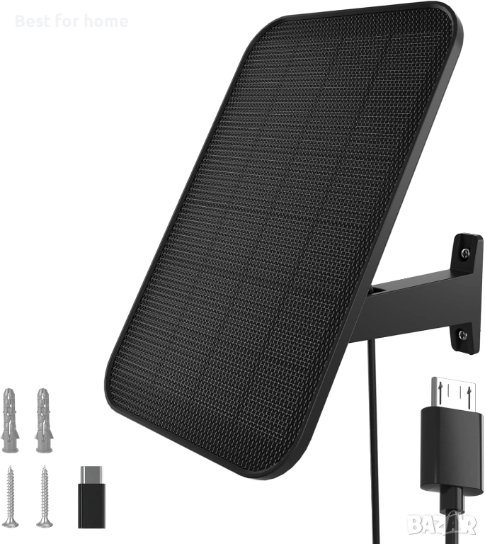 【Какво има в кутията】 3.2W соларен панел ×1, 13-футов Micro USB кабел за зареждане ×1, Micro USB към USB-C адаптер ×1, регулируема стойка за стена ×1, комплект винтове ×1, ръководство за потребителя ×1. Съвместим с: VIRTAVO, Arlo Pro, Arlo Pro 2, Arlo Essential и повечето 5V Micro USB/USB-C акумулаторни камери. *В ПАКЕТА НЕ Е ВКЛЮЧЕНА КАМЕРА.
