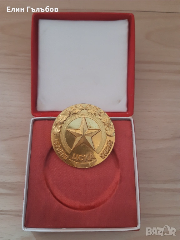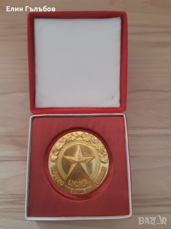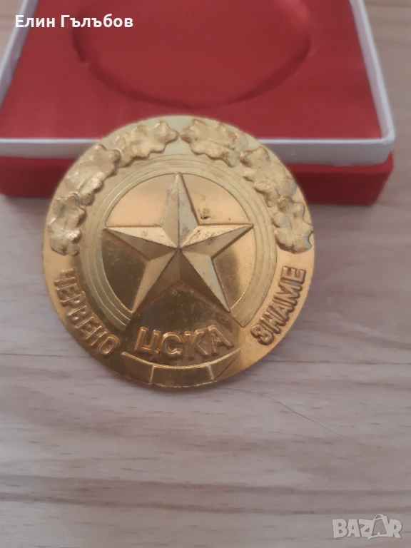 В оригиналната си кутийка плакета на ЦСКА "ЧЕРВЕНО ЗНАМЕ" е в златист цвят .
