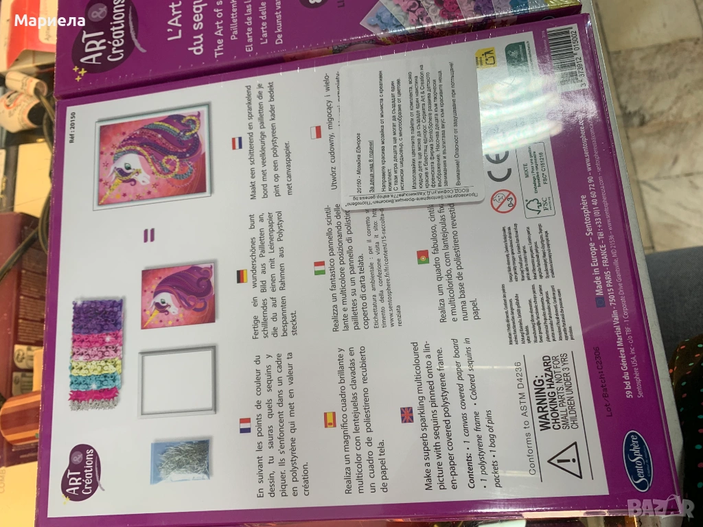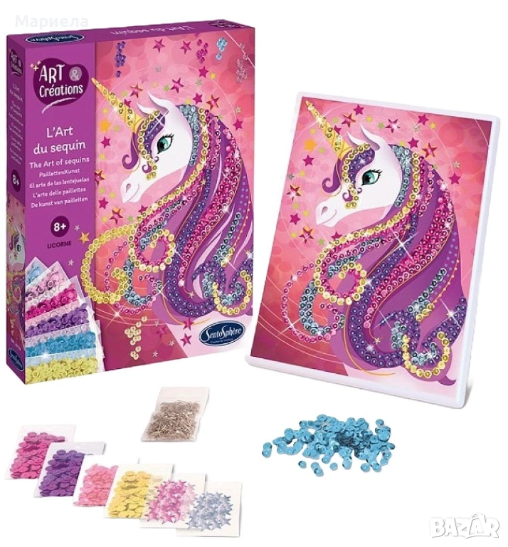 Игрите с мозайки винаги са много интересни и забавни за децата, именно затова Sentosphere представят един чудесен игрален комплект, с който децата ви ще творят. В комплекта малчуганите ще намерят всичко необходимо за направата на красива, блестяща картина на еднорог. В комплекта има: