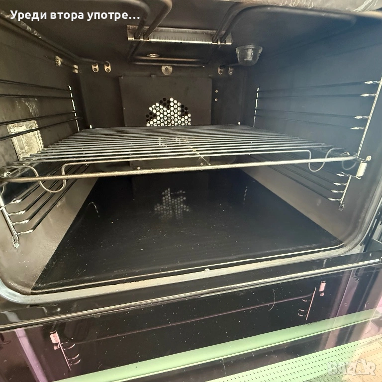Печката е с керамичен плот, механични копчета, разширени зони, оборудване, фурна с вентилатор и грил реотан, размери 60/60/85 см