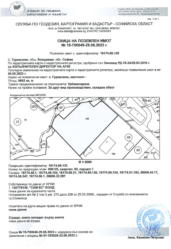 СОБСТВЕНИК, юридическо лице, продава в гр. Божурище имот с площ 9 892 м2.