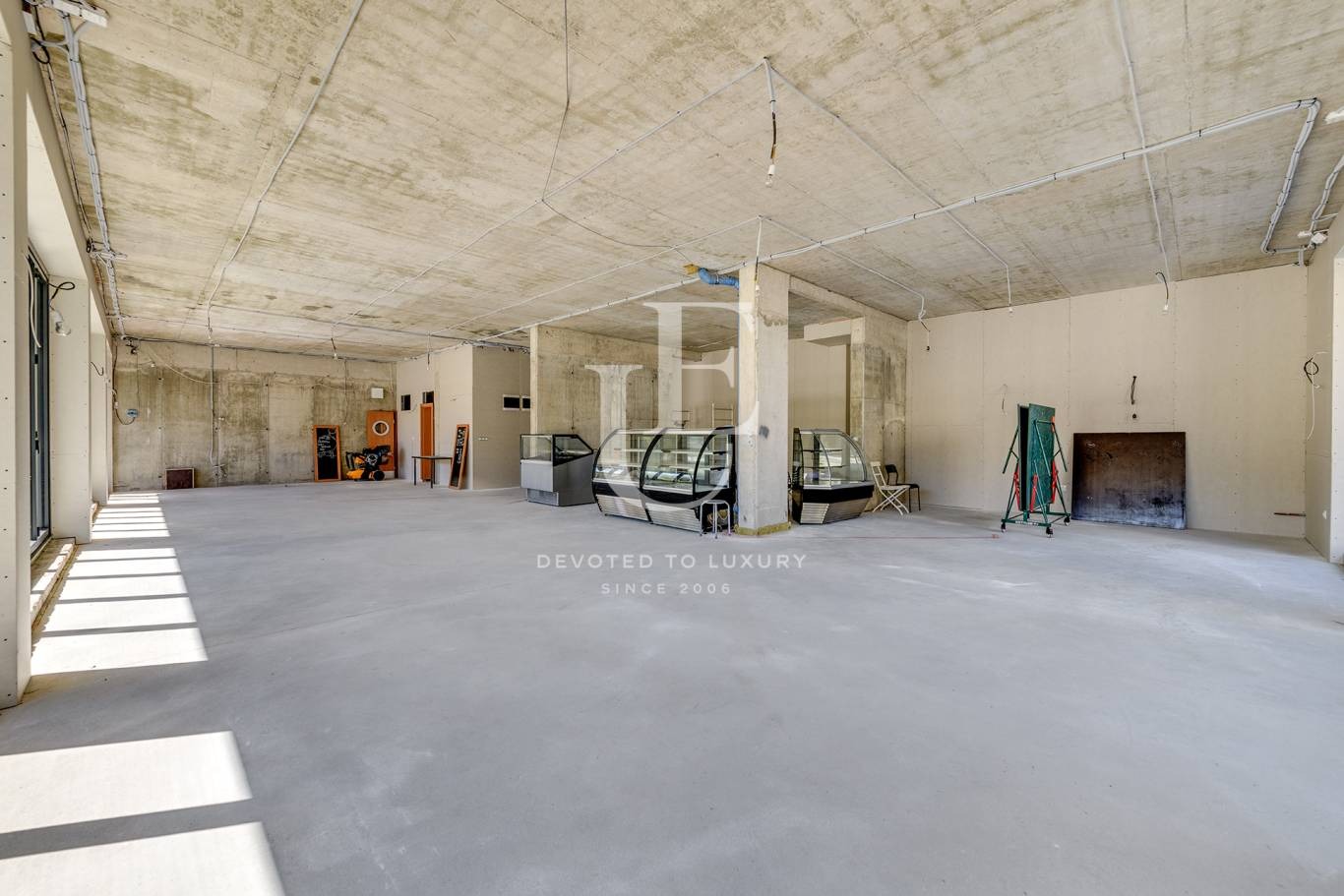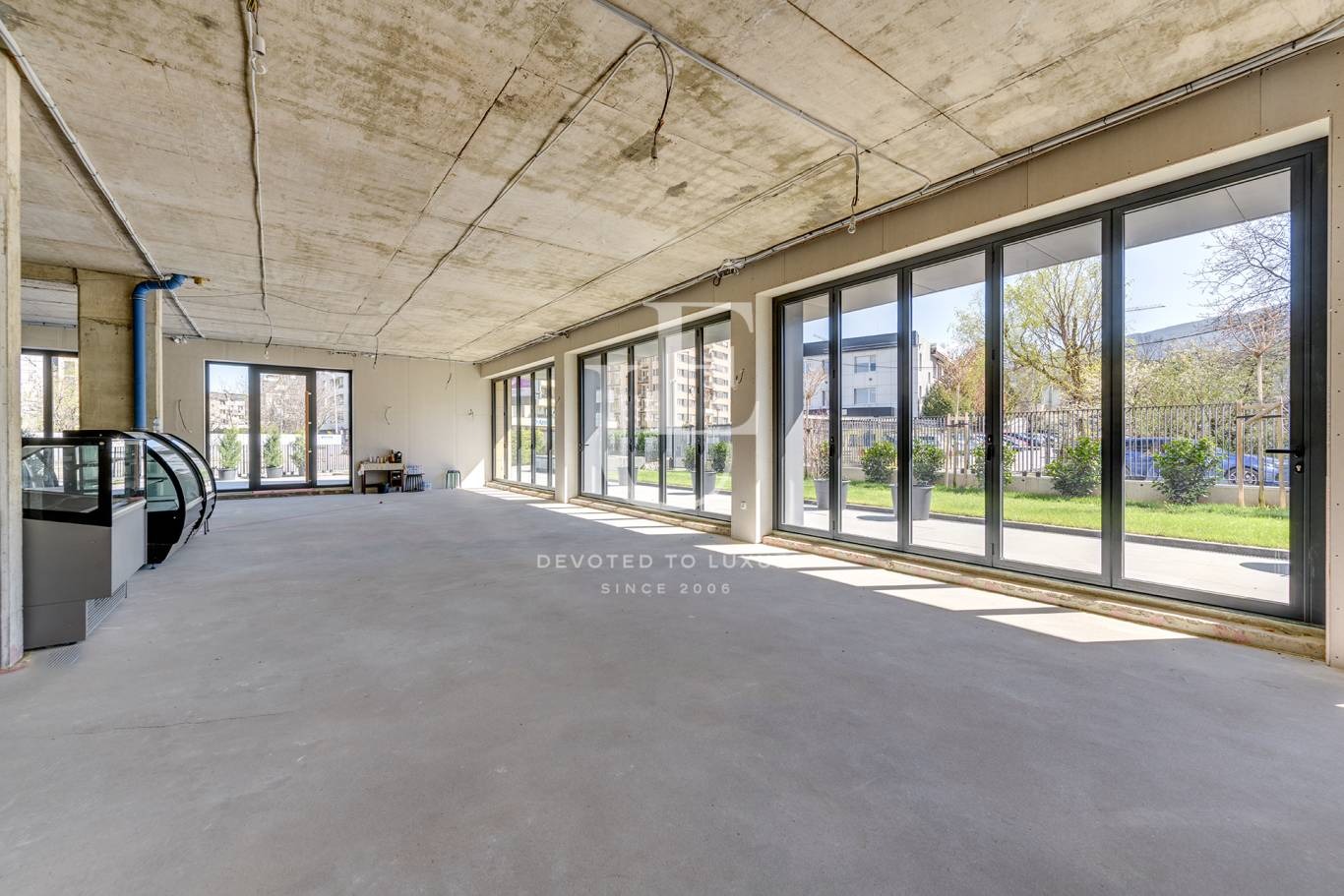 Помещението е с високи тавани, големи витрини и отделен достъп за зареждане и доставки.