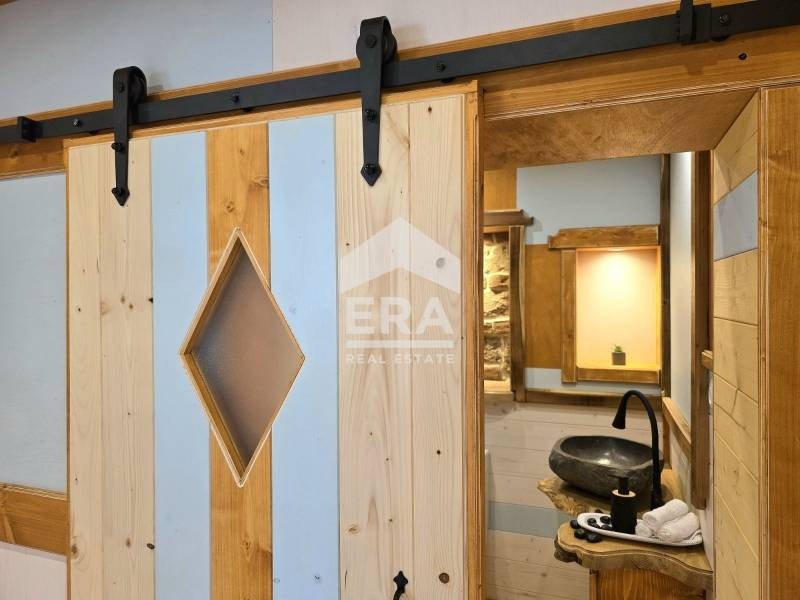 Комбинация от естествени материали камък и дърво както вътре, така и отвън.