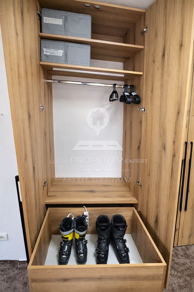 По поръчка изработените гардероби осигуряват отличен капацитет за съхранение, а специално предвидените шкафове за ски обувки с възможност за включване на сушилня добавят практичен и премислен завършек, особено ценен през зимния сезон.