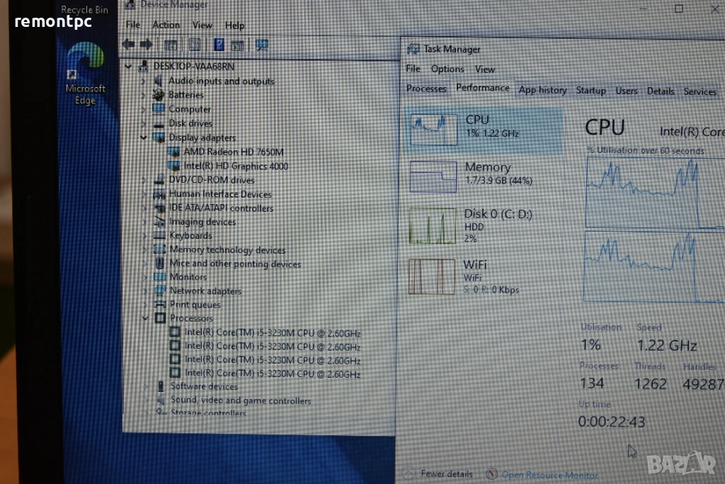 Нова операционна система . Лаптопа е основно почистен и е със сменена термопаста . Сравнително лесен е за обслужване - пада един капак и имате достъп до всичко .