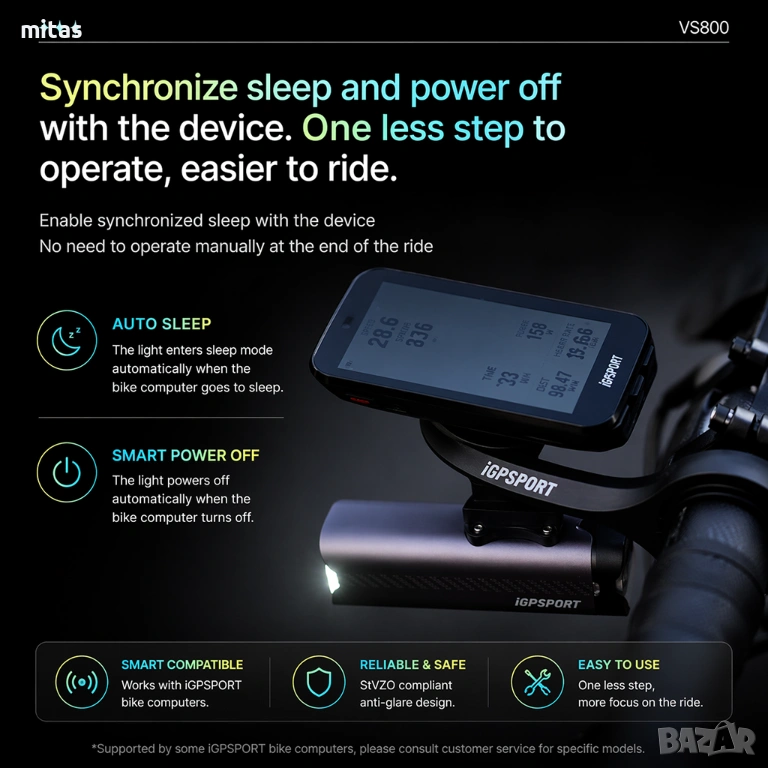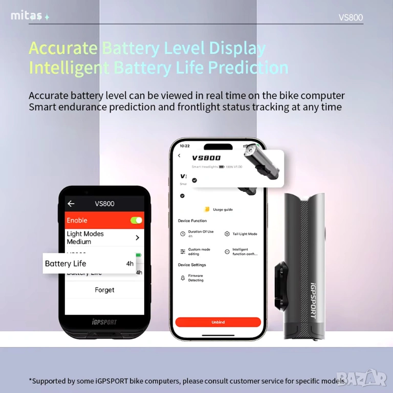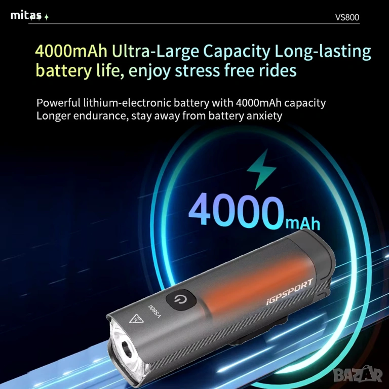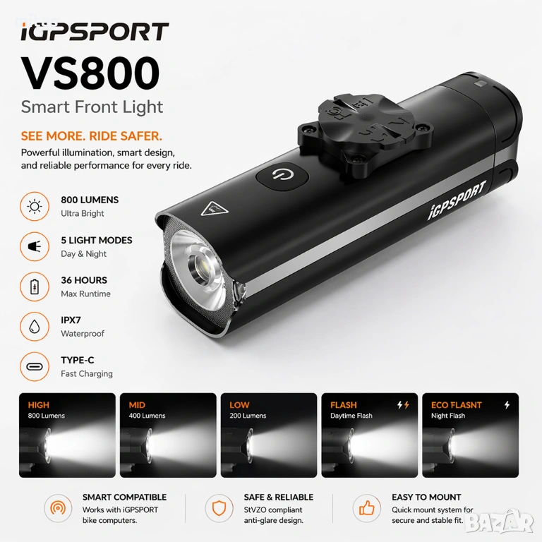 iGPSPORT VS800S, предна светлина велосипед, LED фар велосипед, smart bike light, 800 лумена фар, велосипед светлина USB-C, bike front light smart, вело аксесоари, светлина IPX6, фар за велосипед Bluetooth