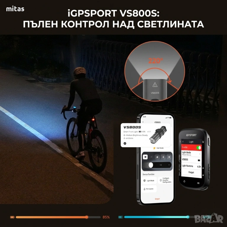 iGPSPORT VS800S е интелигентна предна LED светлина, създадена за оптимална видимост и безопасност при каране. С адаптивна яркост, смарт функции и ефективна линия на осветяване, тя се съобразява с условията и стила на каране.