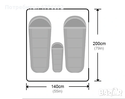 Размери на вътрешната палатка: 200 × 140 × 123 см