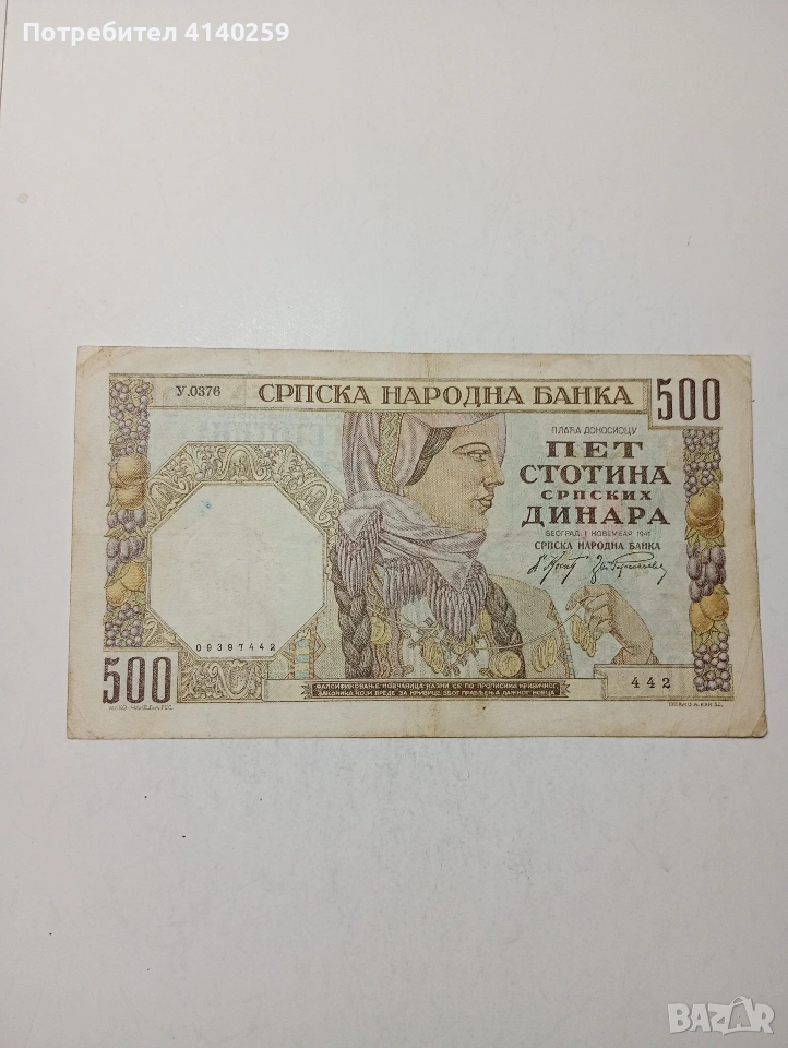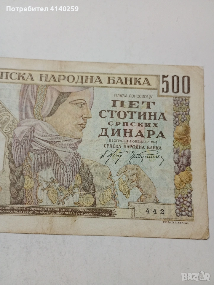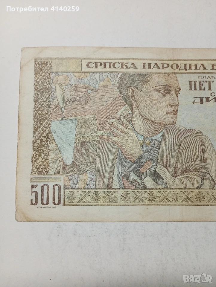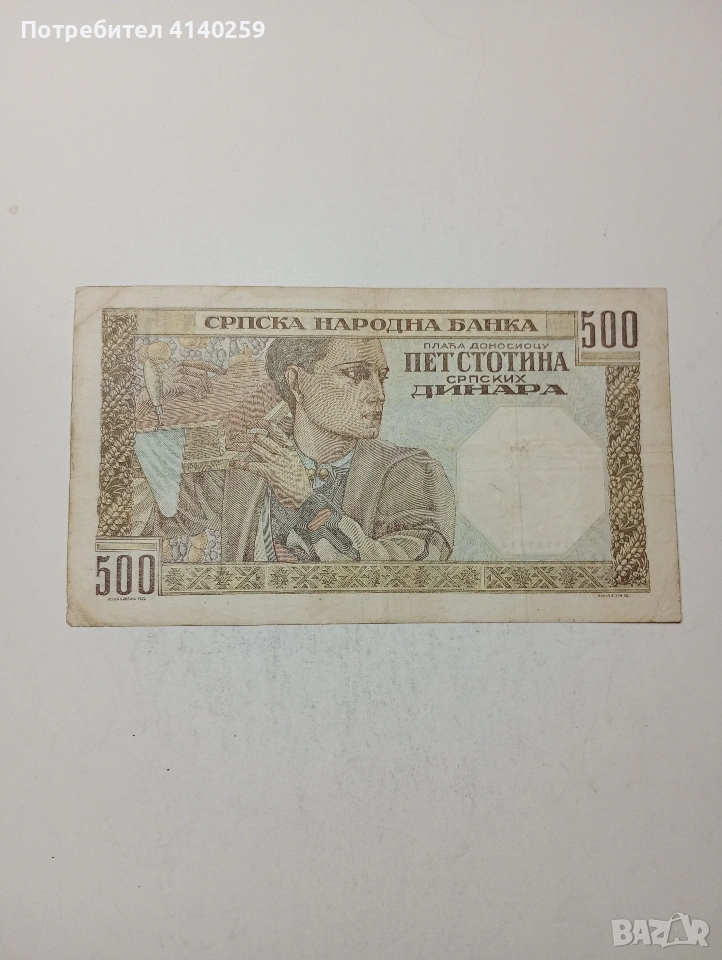 СЪРБИЯ БАНКНОТА 500 ДИНАРА 1941 Г СЪСТОЯНИЕ ВИДИМО ПОЛУЧАВАТЕ СНИМАНАТА БАНКНОТА РАЗГЛЕДАЙТЕ ДРУГИТЕ МИ ОБЯВИ ДА КОМБИНИРАТЕ ДОСТАВКА ЕКОНТ ЗА ВАРНА ЛИЧНО