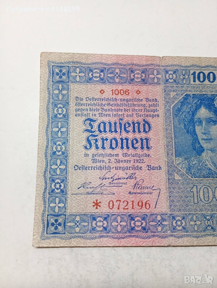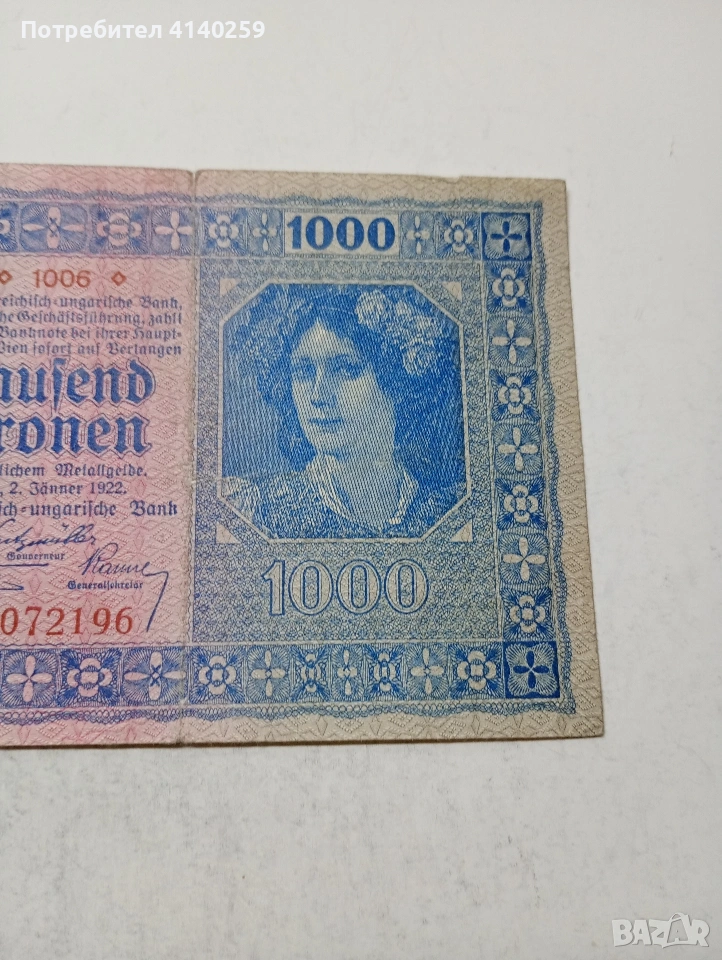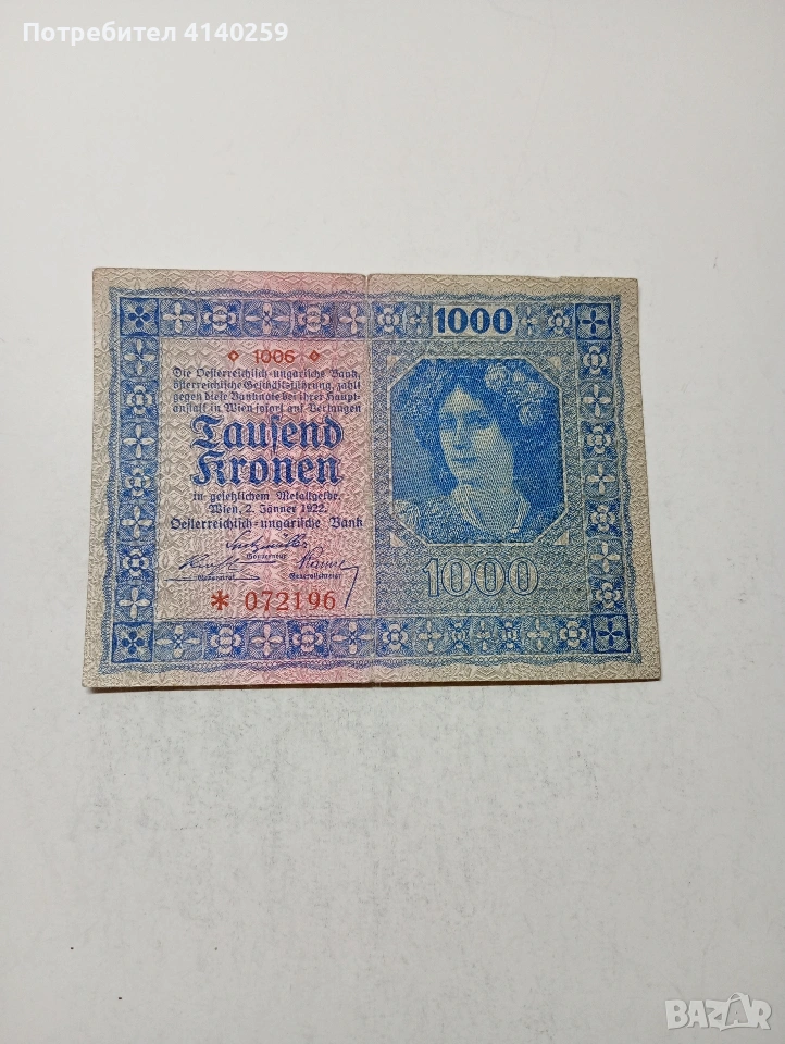 АВСТРИЯ БАНКНОТА 1,000 КРОНИ 1922 Г СЪСТОЯНИЕ ВИДИМО ПОЛУЧАВАТЕ СНИМАНАТА БАНКНОТА РАЗГЛЕДАЙТЕ ДРУГИТЕ МИ ОБЯВИ ДА КОМБИНИРАТЕ ДОСТАВКА ЕКОНТ ЗА ВАРНА ЛИЧНО
