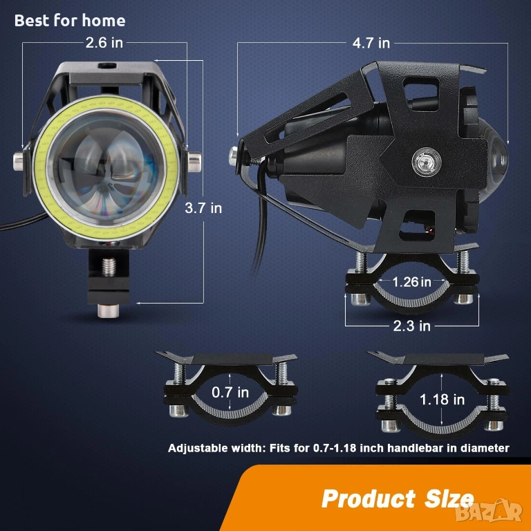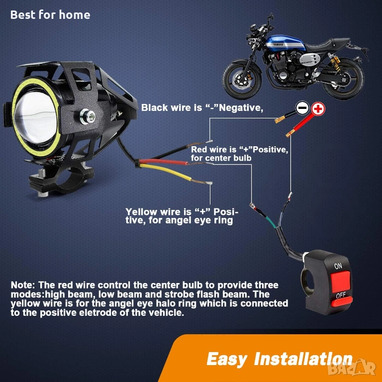 1. LED фар за мъгла за мотоциклет: Цвят на светлината: Бял. Цвят на ангелските очи: Бял. 3 вградени режима на работа: дълги светлини, къси светлини, мигане със стробоскоп. Проектираното разстояние е около 100 метра до 200 метра.