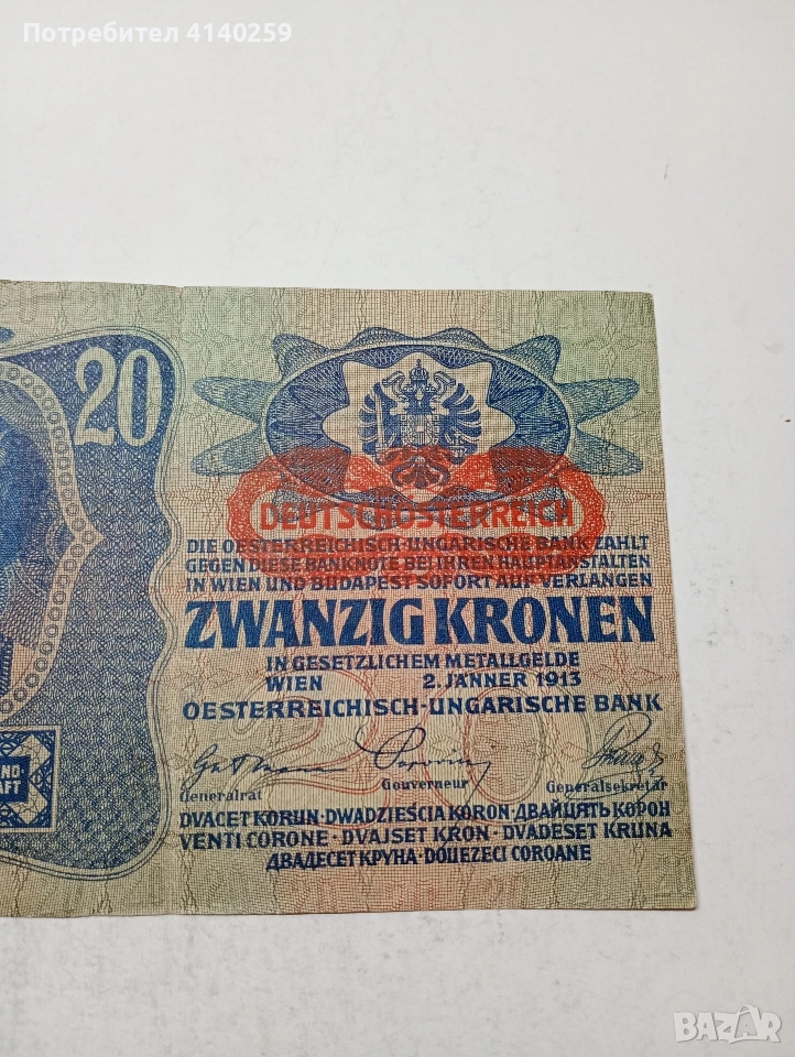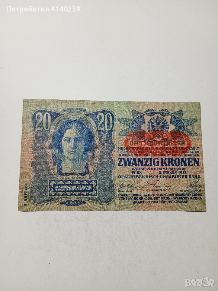 АВСТРО -УНГАРИЯ БАНКНОТА 20 КРОНИ 1913 Г СЪСТОЯНИЕ ВИДИМО ПОЛУЧАВАТЕ СНИМАНАТА БАНКНОТА РАЗГЛЕДАЙТЕ ДРУГИТЕ МИ ОБЯВИ ДА КОМБИНИРАТЕ ДОСТАВКА ЕКОНТ ЗА ВАРНА ЛИЧНО