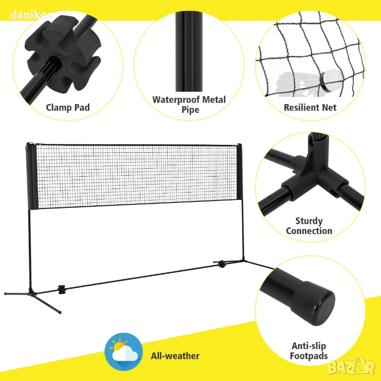 ✅ Стабилна на всяка повърхност: Благодарение на здравата метална рамка и неплъзгащите се крачета, мрежата стои стабилно без нужда от забиване в земята или колчета. Може да се ползва на трева, асфалт или пясък.