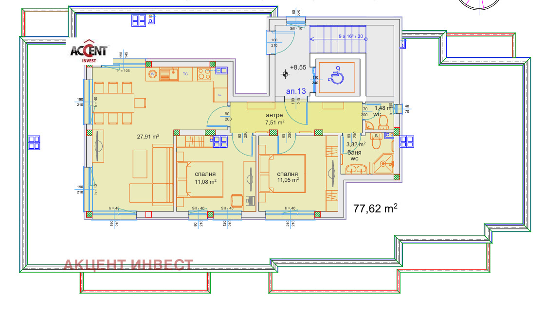 Акцент Инвест ви предлага Тристаен Апартамент с площ от 77,62 кв.м. находящ сена последен, тавански етаж в кокетна малка сграда на три етажа.