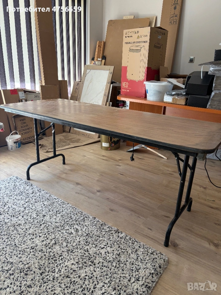 сгъваеми маси с метална конструкция и дървен плот. Подходящи за офис, събития, склад, работилница или временни работни места.