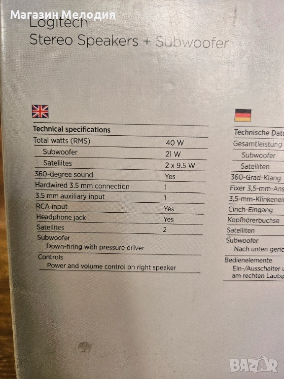 - Обща мощност (RMS): 40 W (2 x 9.5W сателити + 21W субуфер).