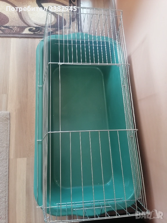 Клетката е ползвана около седмица, защото си купихме по - голяма. Капака е отваряем. Размери : долу дъното е 65/30см, горе - 71,5/35,5см. Височина - 18см, височина с клетката - 38см. Подарявам хранилка за сено + найлон чета за покриване на клетката.