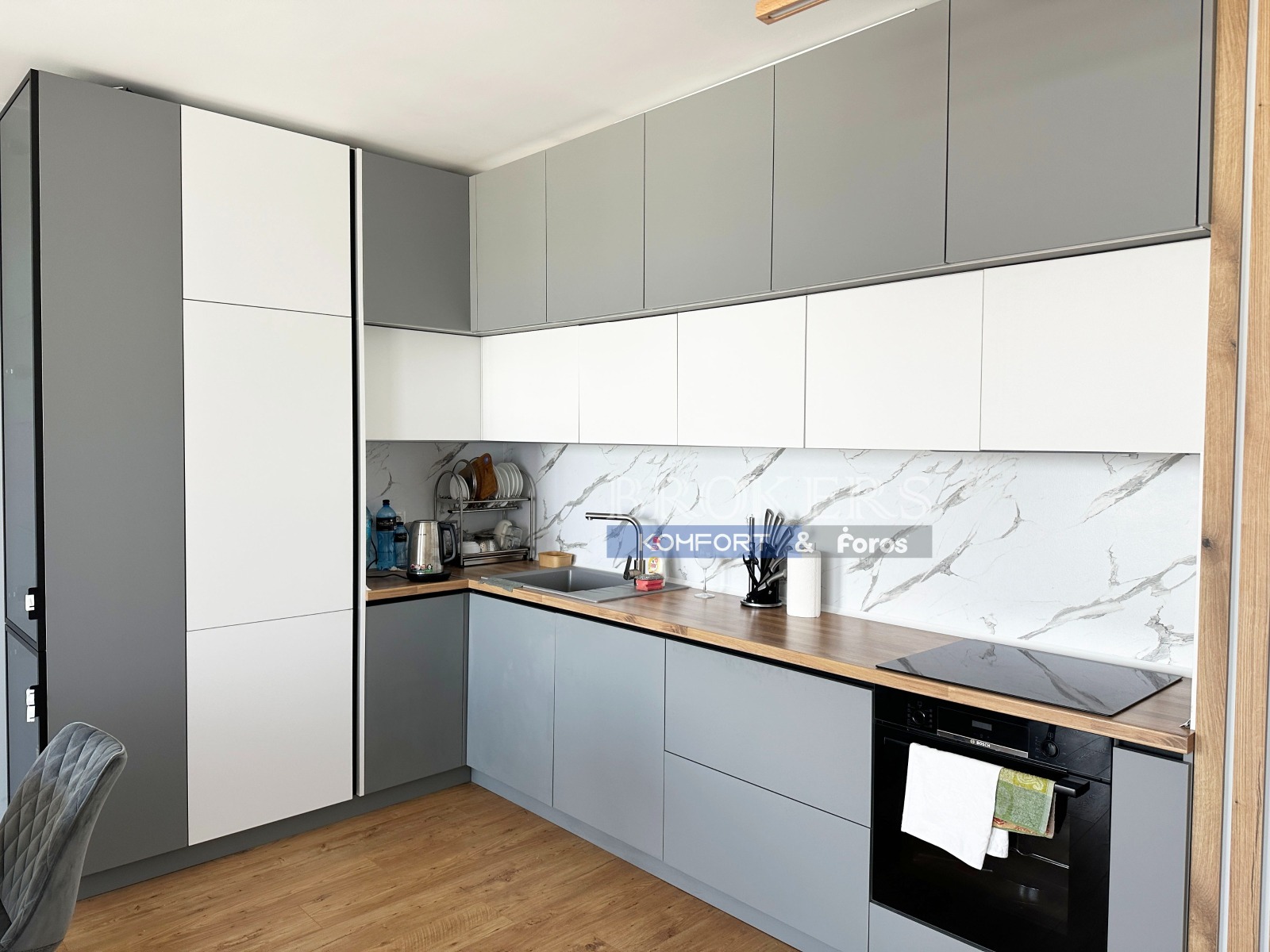 Имотът е със застроена площ 96,4 кв.м. , като предоставя усещане за простор и уют още с влизането. Разположен на ет.11 от 12. Жилището разполага с входно антре с обособена ниша за пералня, просторен дневен тракт с кухненска част (34 кв.м.), две светли спални, баня с тоалетна, втора тоалетна и панорамна тераса с гледка към морето и града. Стилно обзаведен е в пастелни тонове и с висок клас електроуреди. Климатик във всяка стая. Интериорът е изграден с внимание към всеки детайл, използвани са съвременни материали с високо качество и първокласно санитарно оборудване. Не е живяно в него . Към жилището има и маза с площ от 2,5 кв.м.