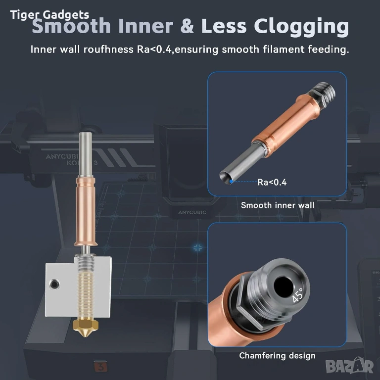 Печатаща глава (hotend) за Anycubic Kobra 3 и Kobra 3 Combo, предназначена за прецизен и стабилен 3D печат с висока скорост и качество. Осигурява плавно подаване на филамента благодарение на вътрешна повърхност с ниска грапавост (Ra < 0.4) и подобрен дизайн против запушване.
