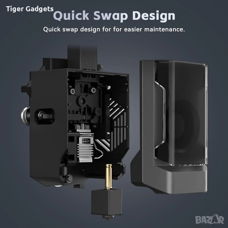 Оборудвана е с 0.4 мм месингова дюза, нагревателен блок и 24V керамичен нагревател/термистор, които осигуряват равномерно нагряване и стабилна температура до 300°C. Специалният дизайн позволява по-добър поток на материала и високоскоростен печат.