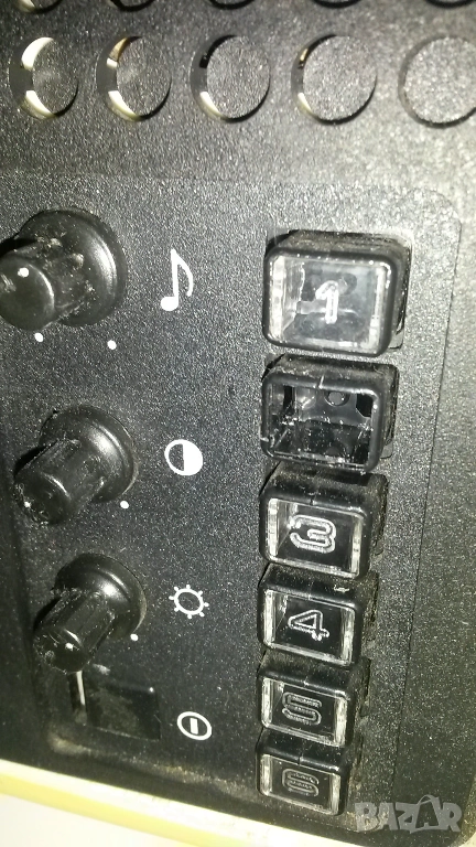 Има копчета от 1 до 6, които работят (поне механично). Копче 1 изглежда пукнато, може би и копче 3. На копче 2 е паднала предната пластмасова част (нямам я).
