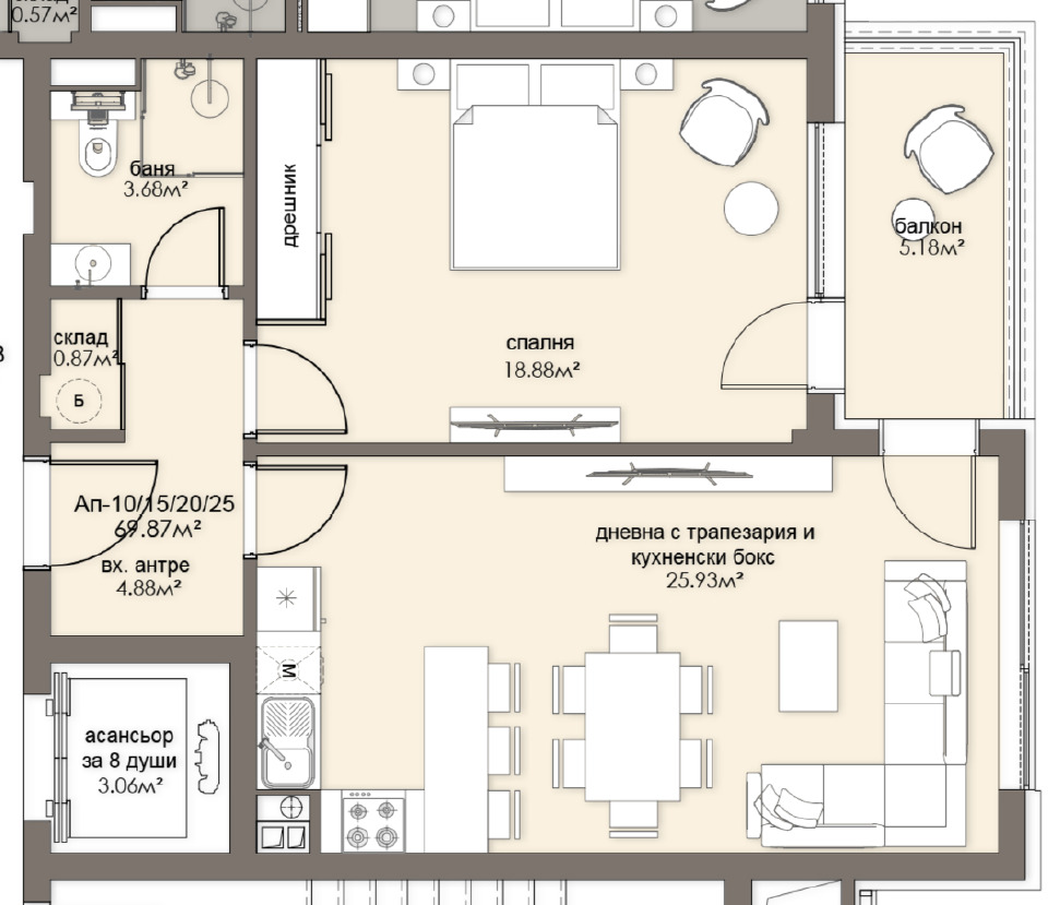 Просторен светъл и уютен двустаен апартамент, отговарящ на всички изисквания за един съвременен дом. Апартамент В25 на схемата. Удобно и функционално разпределение, големи, комфортни и светли помещения. Чиста площ 69,87кв.м., площ с общи части 80,45кв.м. Възможност за пълноценно и безкомпромисно обзавеждане на всички помещения. Изложение изток.