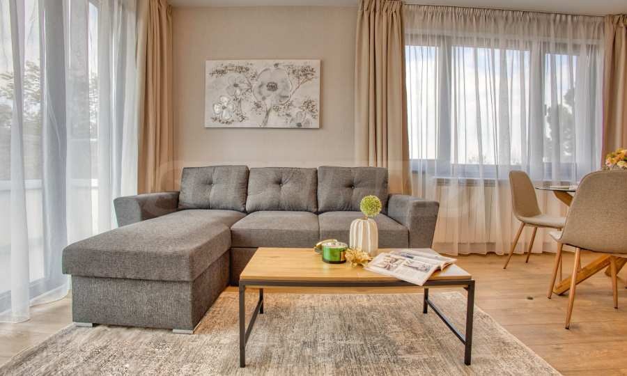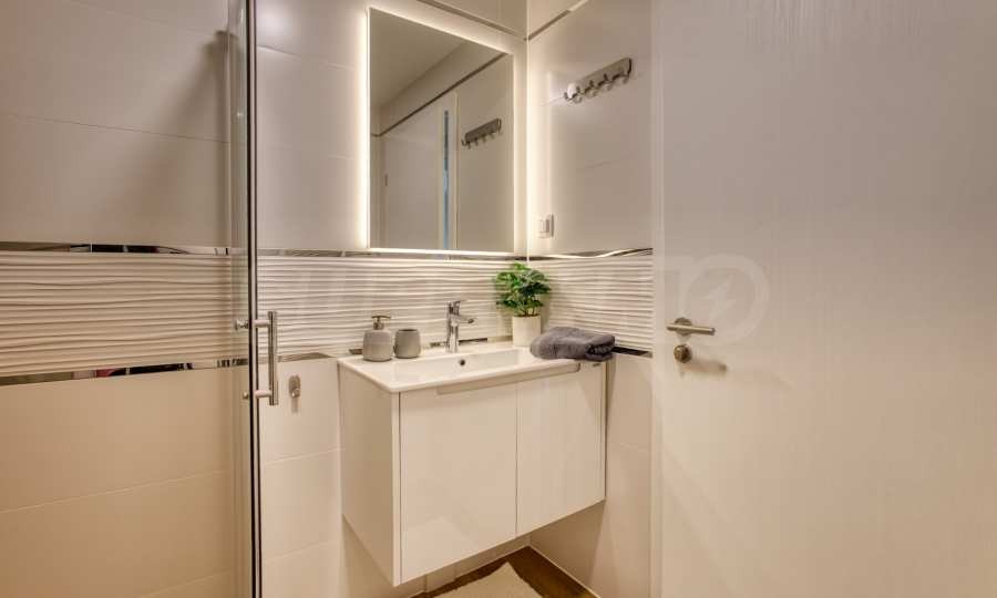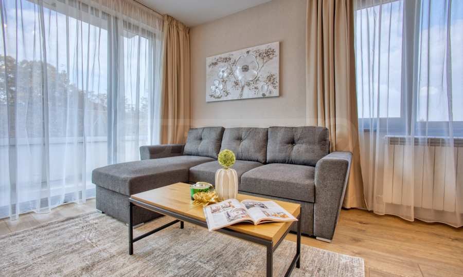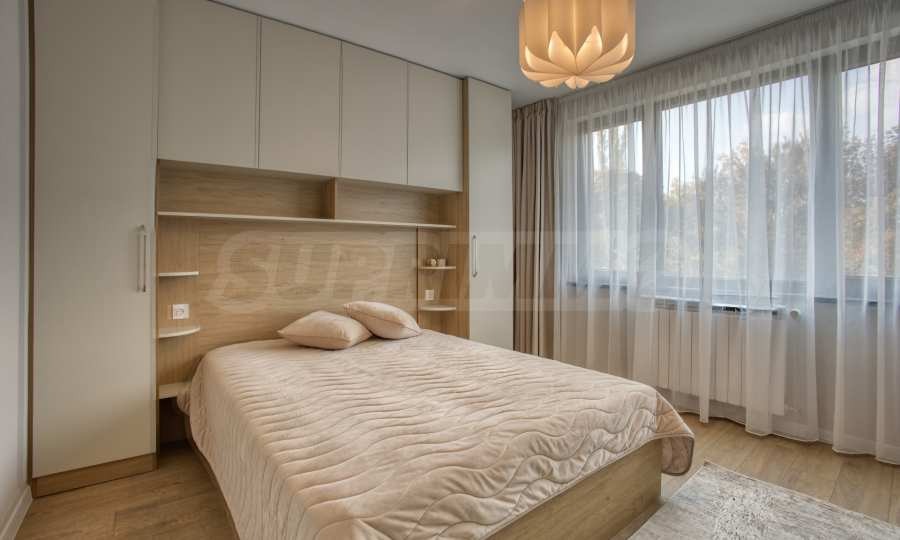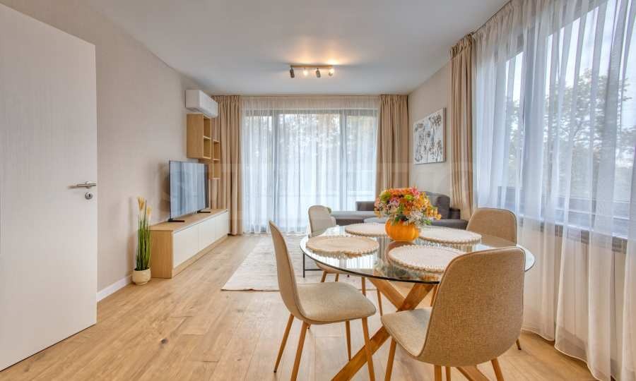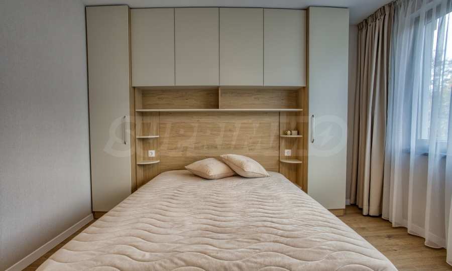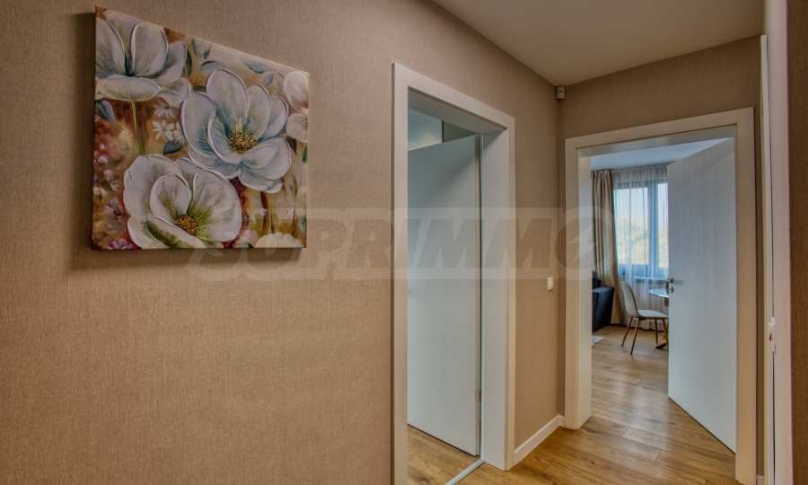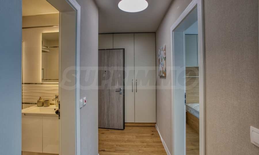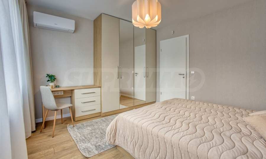 Апартаментът е напълно обзаведен с мебели и висок клас електроуреди, като е оборудван с всичко необходимо за комфортно и спокойно ежедневие. Завършен с изискани интериорни решения, той предлага усещане за простор и уют във всяко помещение.