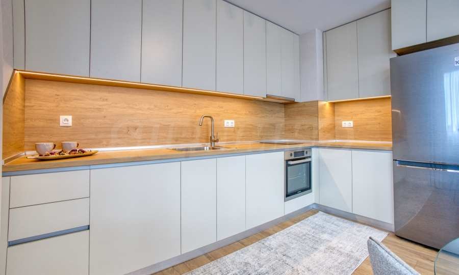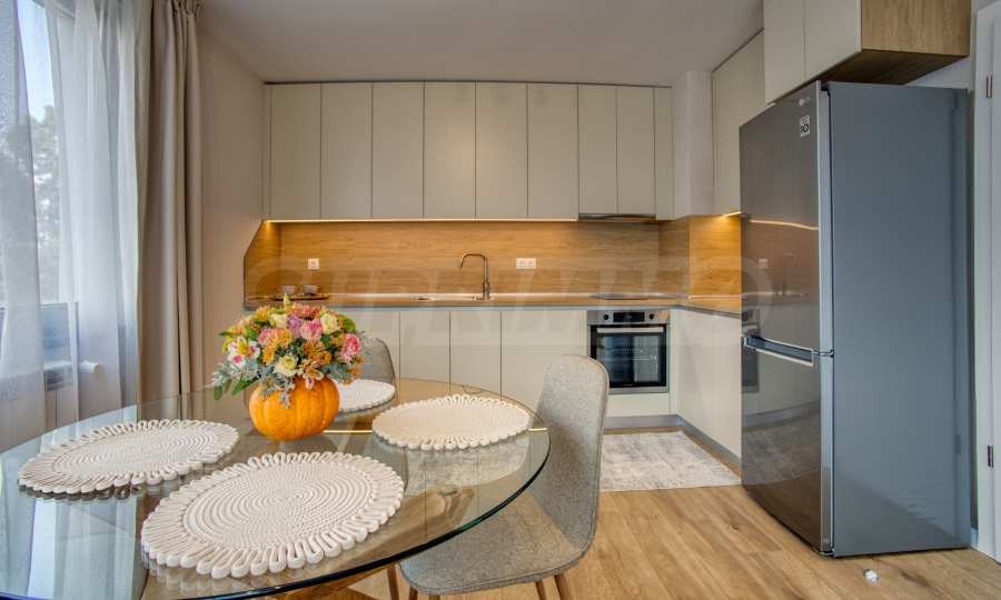 Всекидневна с кухненски бокс светла и просторна, обзаведена с удобен диван, трапезна маса и телевизор; кухненската зона е оборудвана с всички необходими уреди: хладилник, фурна, котлони, абсорбатор и пералня т.н;