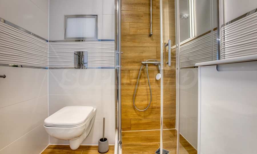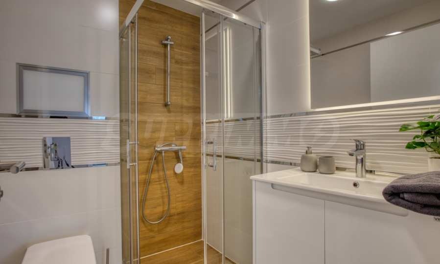 Баня с тоалетна модерно обзаведена с душ кабина, шкафче с мивка и огледало;
