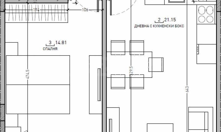 Разпределение: входно антре, просторен хол с трапезария и кухненски бокс, спалня, баня с тоалетна, мокро помещение/тоалетна, тераса.